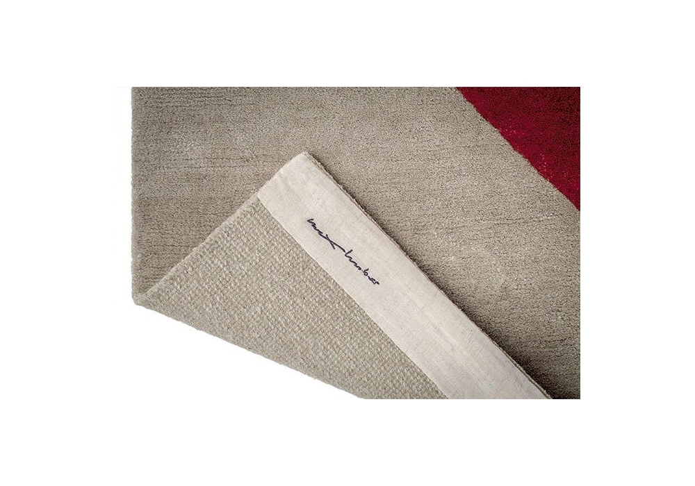 Billie von Max Huber für Poltrona Frau entworfen, ist ein Teppich, der auf Holzwebstühlen handgeknüpft ist. Das geometrische Muster besteht aus einem Kreis und einer vertikalen Linie in einem intensiven roten Farbton und zwei senkrechten Linien in Anthrazitkohlegrau. Zusammensetzung: 50% natürliche Wolle und 50% natürliches Leinen.