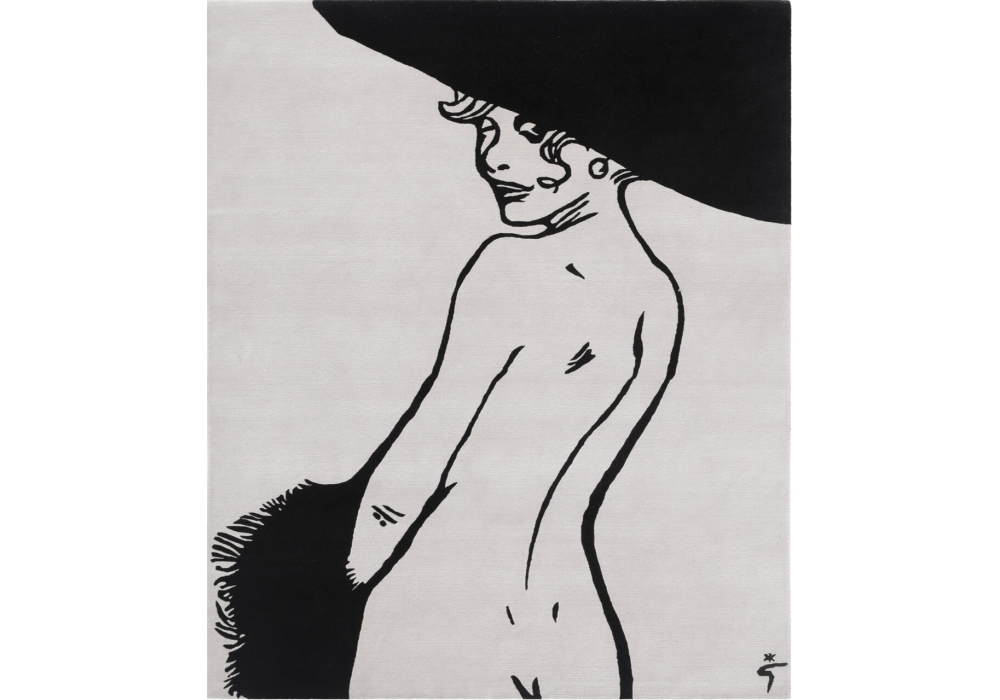 Woman von René Gruau für Amini entworfen, ist ein handgeknüpfter Teppich aus 100% neuseeländischer Wolle mit auf dem Rücken gedrehten und mit Stoff bezogenen Fransen.