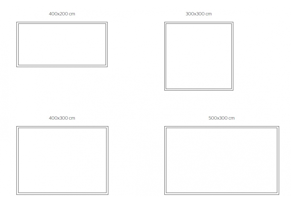 | Abmessungen | 300 x 300 cm; 400 x 200 cm; 400 x 300 cm; 500 x 300 cm. |