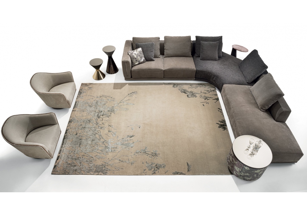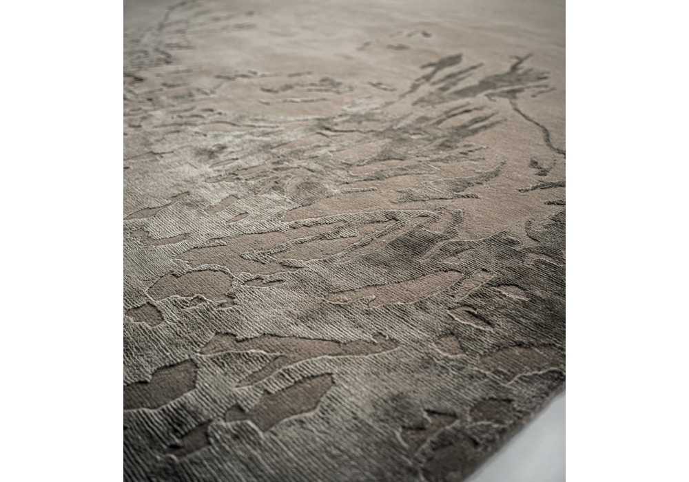Grove von Ben Wu für Longhi entworfen, ist ein Teppich aus 80 % Wolle und 20 % Naturseide. Es ist möglich, den Teppich nach Maß zu fertigen. Da natürliche Farben verwendet werden, sind die Farbtöne nur als Anhaltspunkt zu betrachten. Wollbasis, geprägtes Seidendesign, Seidenrahmen.