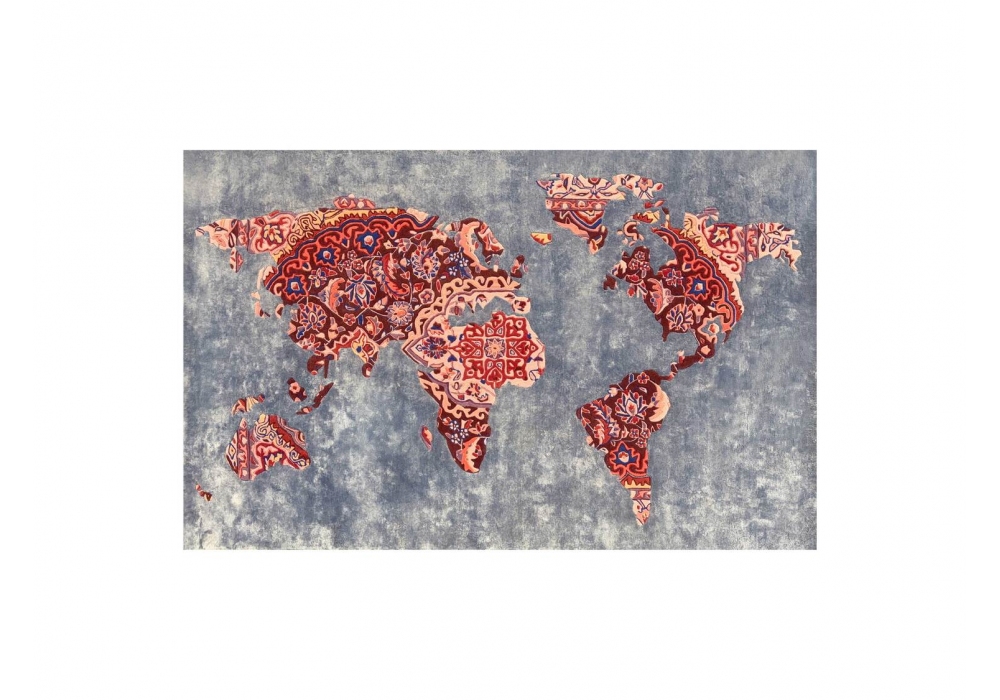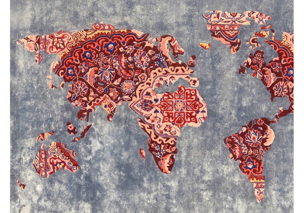 Mondo von Lorenzo Damiani für Cappellini entworfen, ist ein Viskose-Teppich, der das Thema des Atlas neu interpretiert, wobei die Kontinente durch Fragmente eines alten Perserteppichs gespiegelt und umrissen werden.