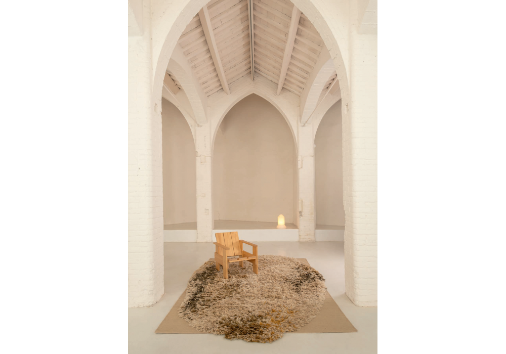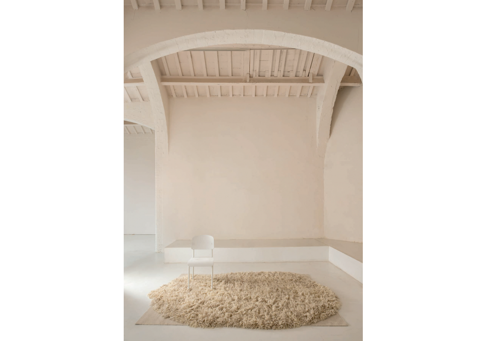Alga hergestellt und signiert von Nanimarquina ist ein handgeknüpfter und handgewebter Dhurrie-Teppich aus 50 % afghanischer Wolle, 20 % neuseeländischer Wolle, 21 % Schurwolle und 9 % Jute (ockerfarbene Version), 50 % afghanischer Wolle, 29 % neuseeländischer Wolle und 21 % Schurwolle (graue Version) und 55 % afghanischer Wolle und 45 % neuseeländischer Wolle (cremefarbene Version).