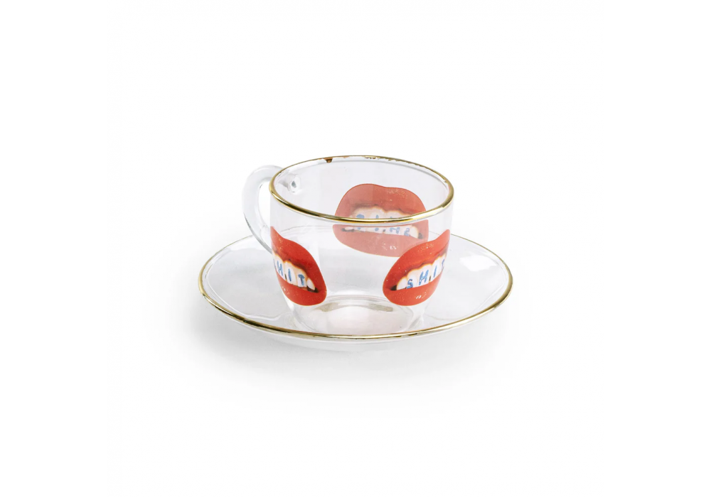 Shit von Toiletpaper für Seletti entworfen ist eine Kaffeetasse mit Untertasse aus transparentem Borosilikatglas. Der Rand der Untertasse und der Tasse ist goldfarben, während die Drucke an den Seiten mit verschiedenen Pigmenten gefärbt sind.