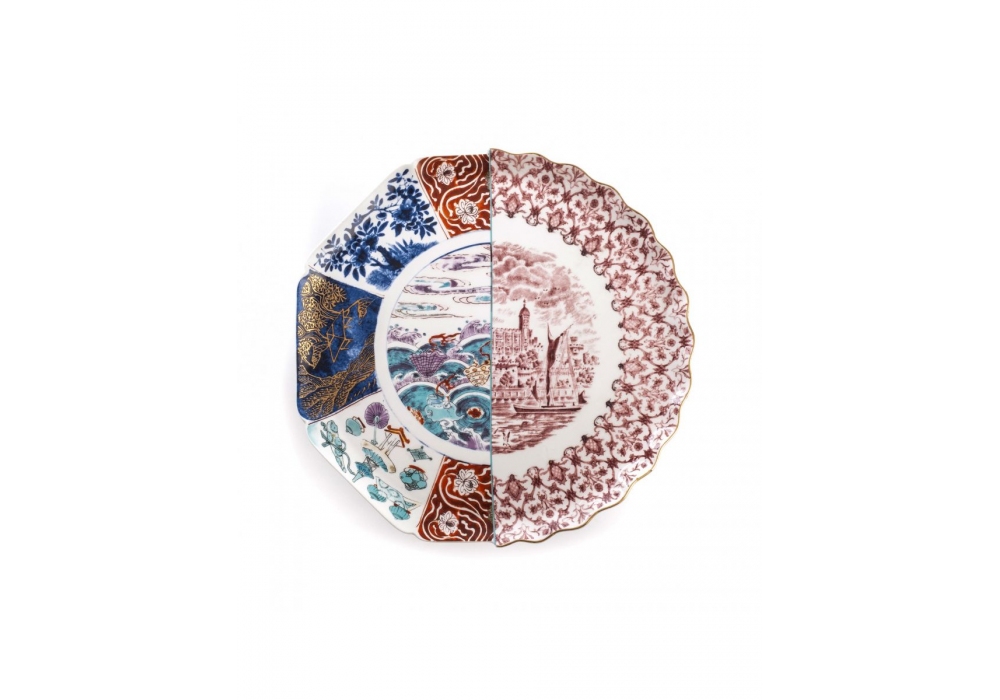Hybrid Moriana, entworfen von CtrlZac für Seletti, ist ein runder Tortenständer, der vollständig aus Porzellan besteht und mit verschiedenen Figuren und Pigmenten verziert ist.