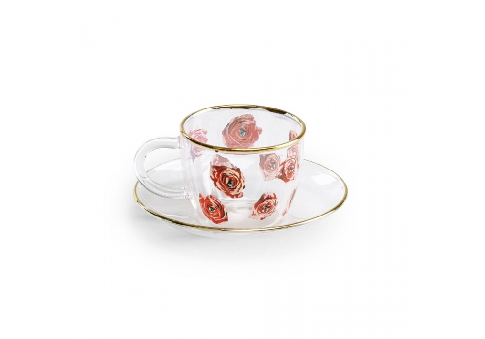 Roses von Toiletpaper für Seletti entworfen ist eine Kaffeetasse mit Untertasse aus transparentem Borosilikatglas. Der Rand der Untertasse und der Tasse ist goldfarben, während die Drucke an den Seiten mit verschiedenen Pigmenten gefärbt sind.