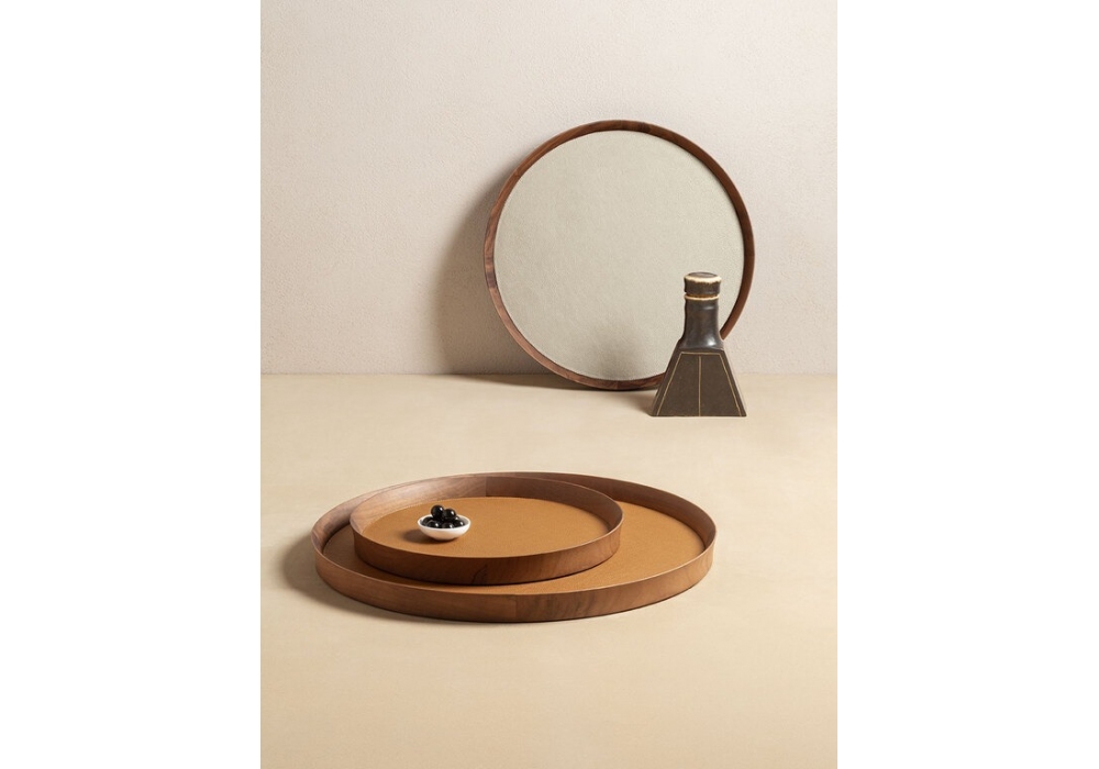 Die von Giobagnara für Poltrona Frau entworfene Tableware-Kollektion ist ein rundes oder viereckiges Tablett aus Walnussholz mit Pelle Frau®-Beschichtung. Die Tableware Collection ist in verschiedenen Ausführungen und Modellen erhältlich.