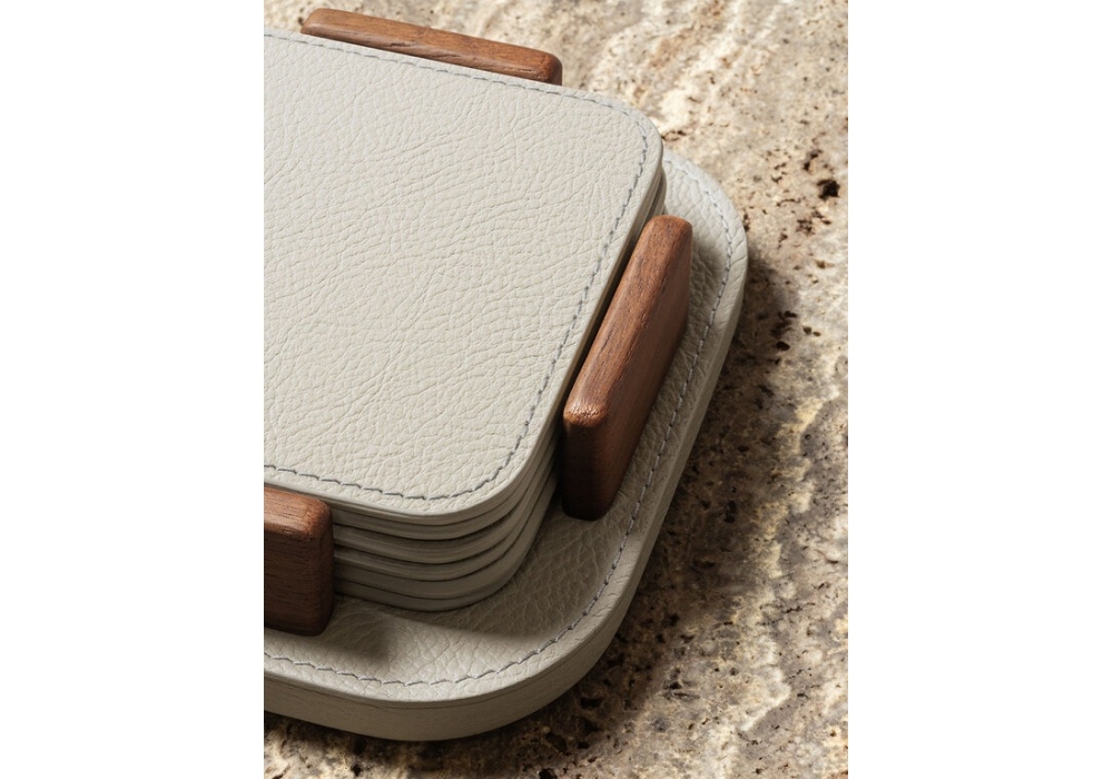 Die von Giobagnara für Poltrona Frau entworfene Tableware-Kollektion besteht aus 6 viereckigen Untersetzern mit abgerundeten Ecken aus Pelle Frau®. Der Untersetzerhalter besteht aus Holz mit Details aus Walnussholz, bezogen mit Pelle Frau®-Leder.