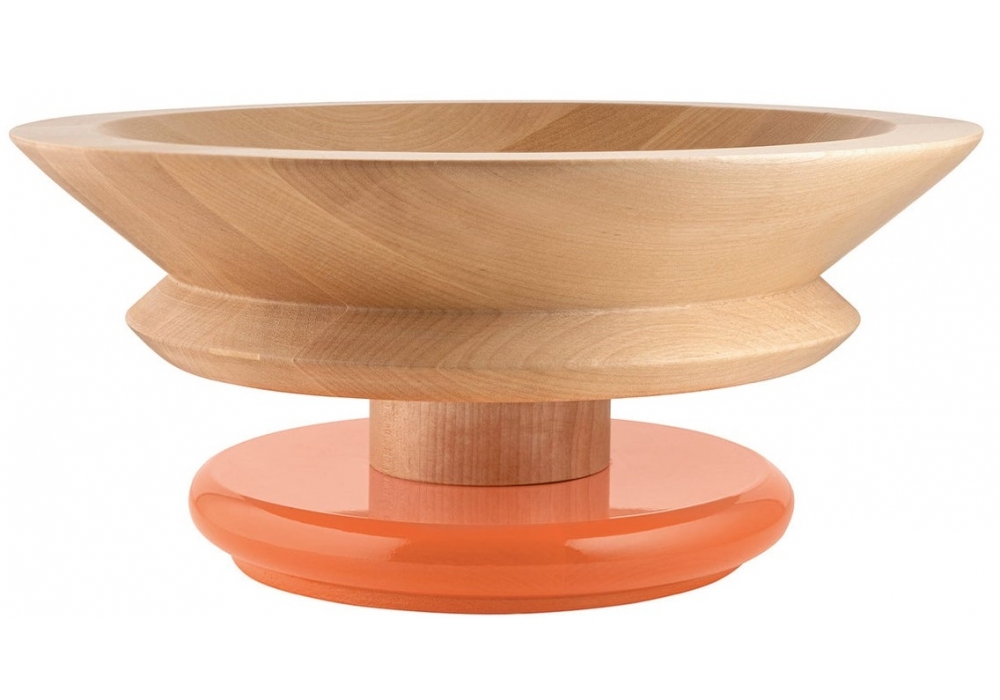 ES15 von Ettore Sottsass für Alessi entworfen, ist ein Tafelaufsatz aus Lindenholz mit Sockel erhältlich in zwei Farben: Orange und Gelb.