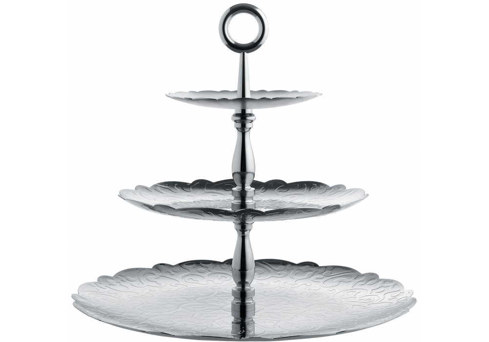 The Seal von Marcel Wanders für Alessi entworfen, ist ein Tortenständer mit drei Ebenen aus Edelstahl mit Reliefdekor.