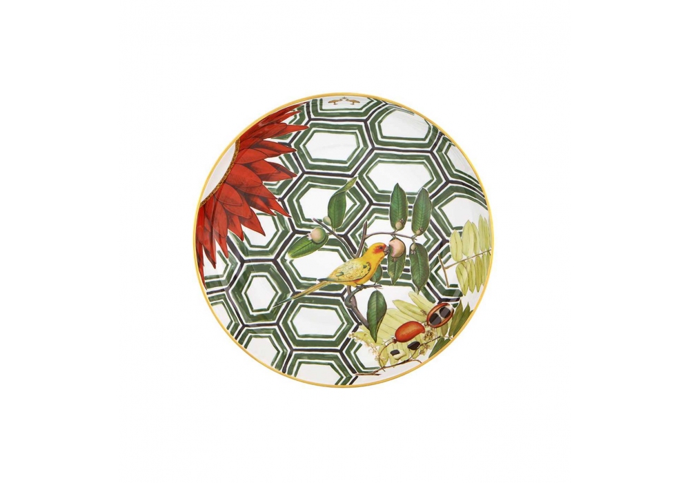Amazonia von Vista Alegre mit Ecoarts entworfen, ist ein Herzstück aus Porzellan mit Dekorationen, die von Flora und Fauna inspiriert sind.