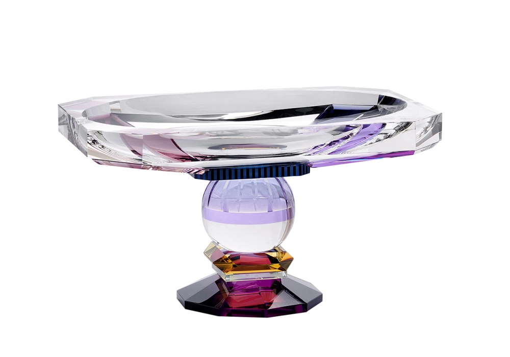 Georgia produziert und signiert von Reflections Copenhagen, ist ein Herzstück aus Kristall, das durch verschiedene geometrische Elemente strukturiert ist, die von Hand in transparent, blau, gemischt lila, transparent und gelb geschnitzt und veredelt wurden.