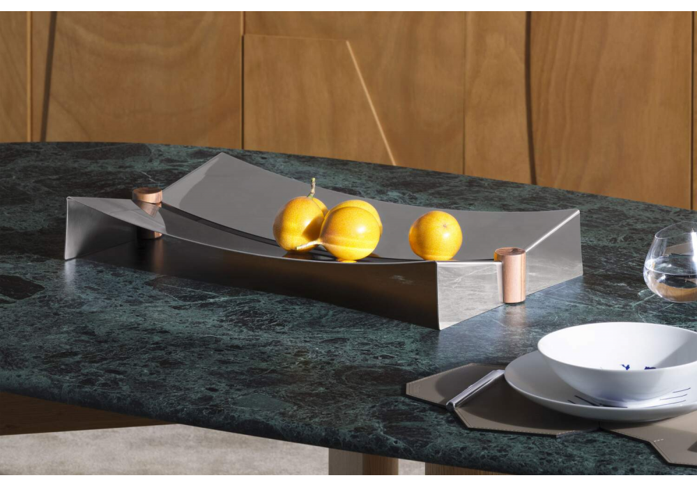 Glyntea von Chiara Andreatti für Cassina entworfen, ist ein Tafelaufsatz aus poliertem Edelstahl und Details aus Canaletto-Nussbaum oder schwarz gebeizter Esche.