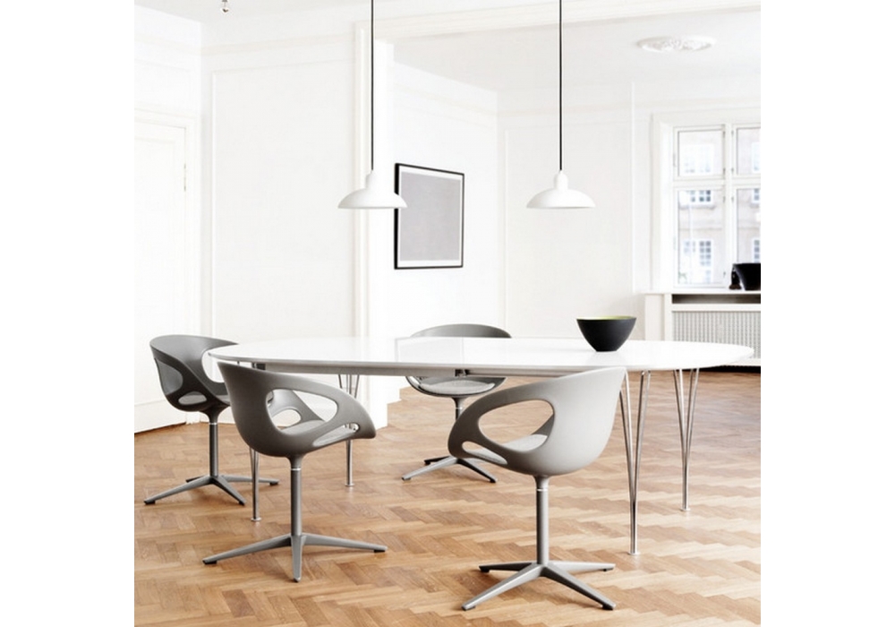 Superellipse von Piet Hein und Bruno Mathsson für Fritz Hansen entworfen, ist ein Tisch mit Platte aus Laminat oder Holz und Beinen aus verchromtem oder pulverbeschichtetem Stahl. Verfügbar in mehreren Ausführungen und Abmessungen.