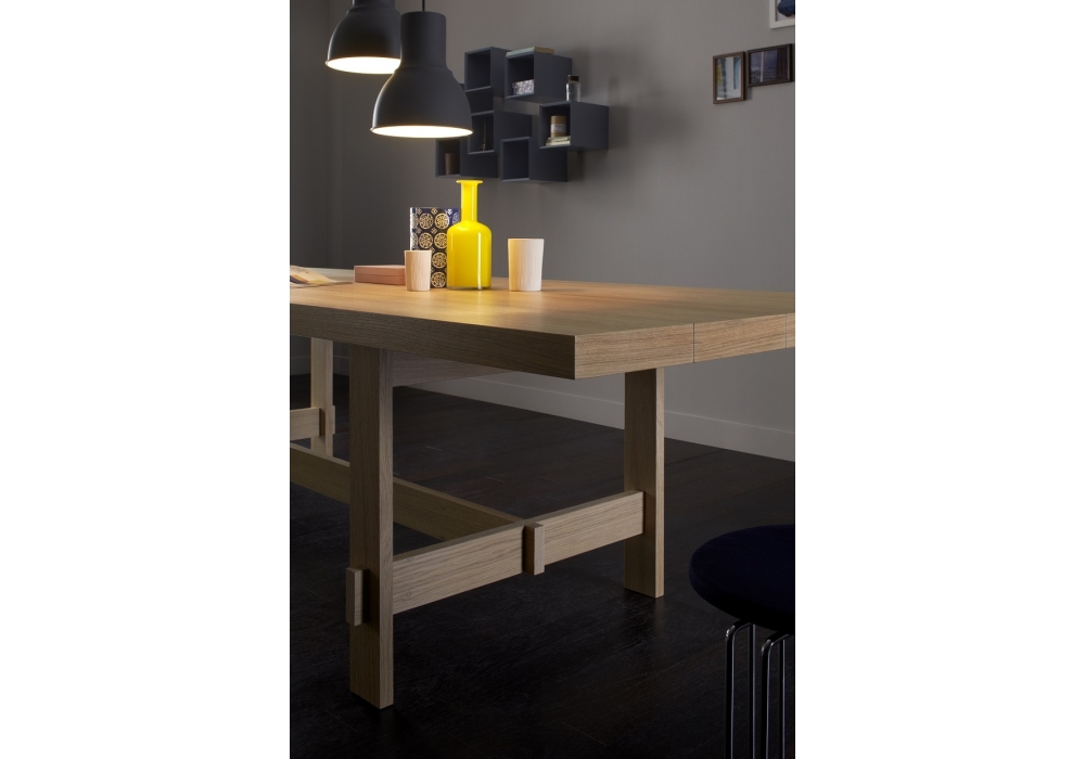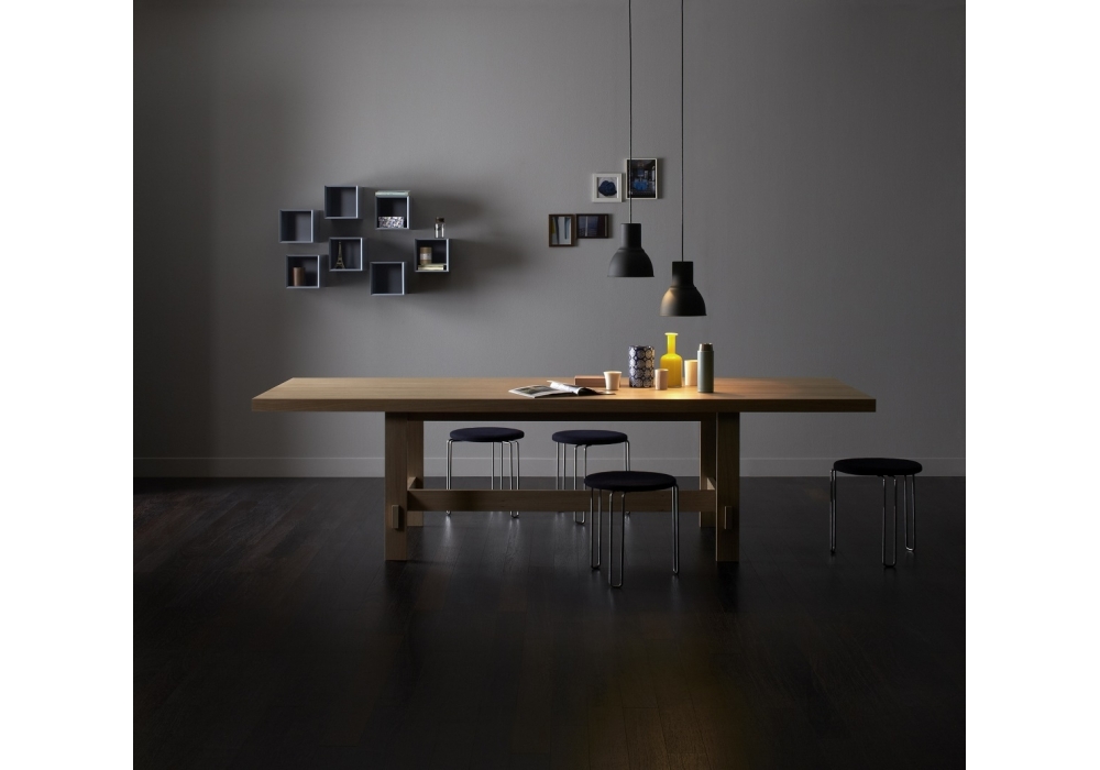 Share von Silvano Pierdonà für Capodopera entworfen, ist ein Tisch mit einer Platte aus Wabenplatten und Beinen aus furnierten Holzplatten in verschiedenen Ausführungen. Verügbar in zwei Dimensionen.