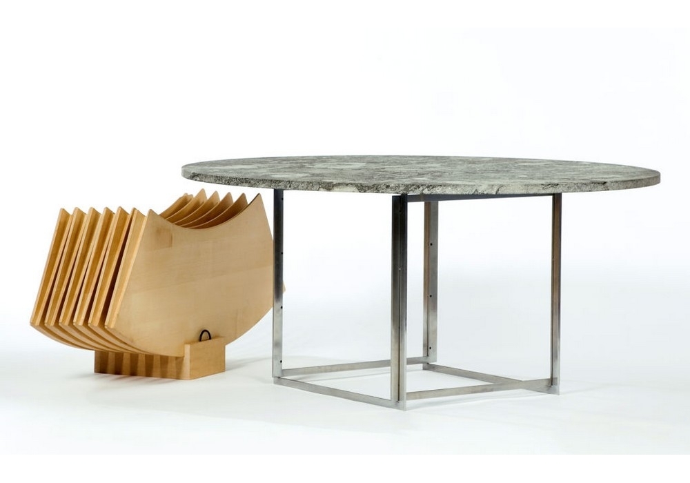 PK54 + PK54A von Poul Kjærholm für Fritz Hansen entworfen, ist ein Tisch mit Platte aus Marmor oder Granit und Basis aus gebürstetem satiniertem Edelstahl. Expansionsring, 6-teilig, aus unbehandeltem massivem Ahorn. Verfügbar in mehreren Ausführungen.