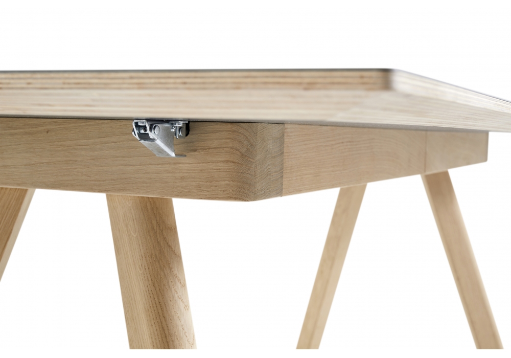 Copenhague CPH 30, das von Ronan und Erwan Bourullec für Heu entworfen wurde, ist ein ausziehbarer Tisch mit Top in Sperrholz mit Laminat, Linoleum oder Furnier in verschiedenen Oberflächen. Die Kante des Tischplattens entspricht dem Finish des Rahmens. Geneigte massive Holzbeine mit integriertem unsichtbarem Schraubenverbindung und ausziehbare verstellbare Füße zum Nivellieren des Tisches auf ungleichmäßigen Oberflächen. Verügbar in verschiedenen Abmessungen und Oberflächen