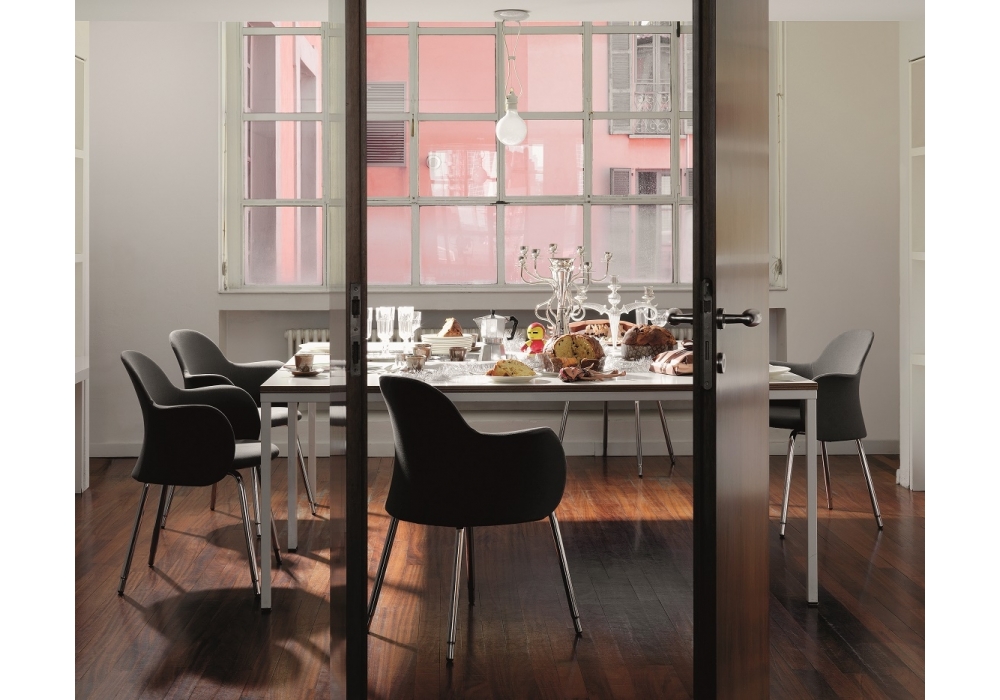 Quadrato, entworfen und hergestellt von DePadova, ist ein Tisch mit Basis aus weiß pulverbeschichtetem Stahl und Platte aus Spanplatte mit Kante aus Marine-Sperrholz, die mit weißem HPL-Laminat bedeckt ist. Erhältlich in verschiedenen Größen.