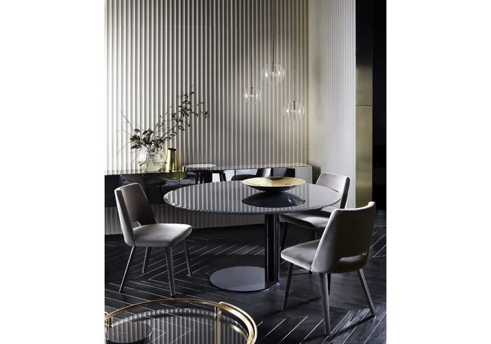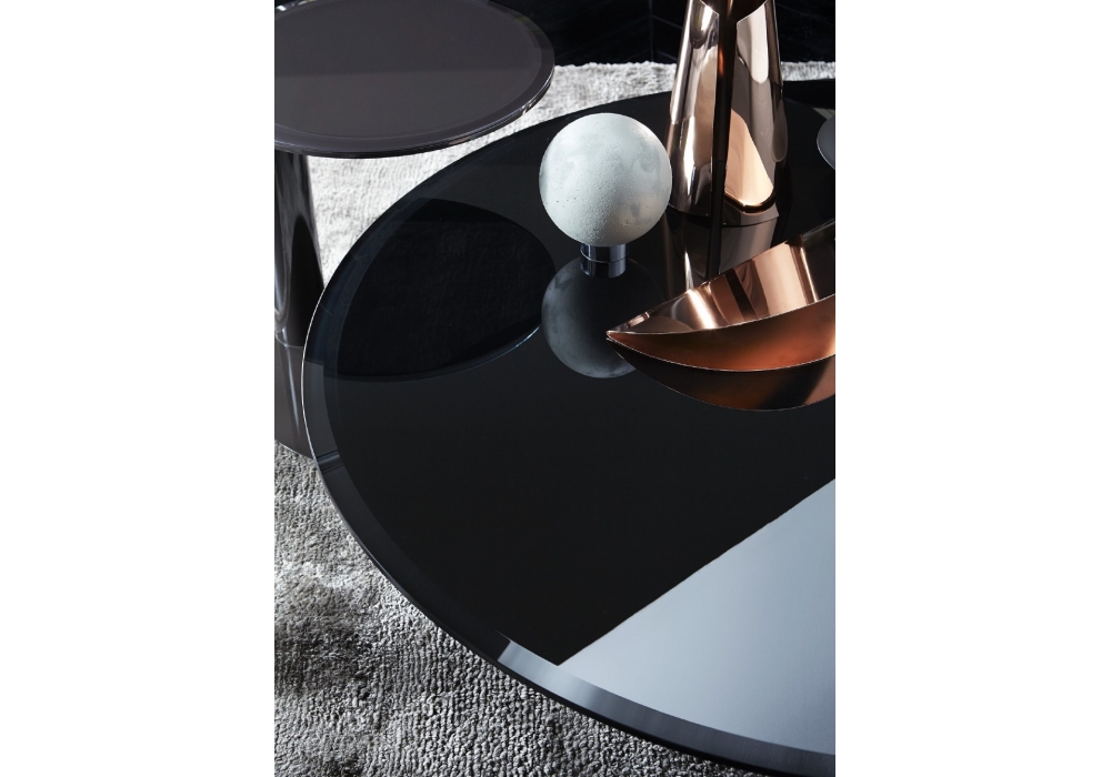 Oto von Oscar & Gabriele Buratti für Gallotti&Radice entworfen, ist ein Tisch. Glasplatte mit Facettschliff. Gestell Metall hochglänzend lackiert. Verfügbar in schwarz, blau grau und schwarzbraun.