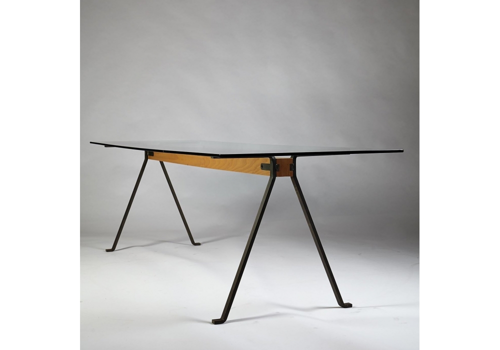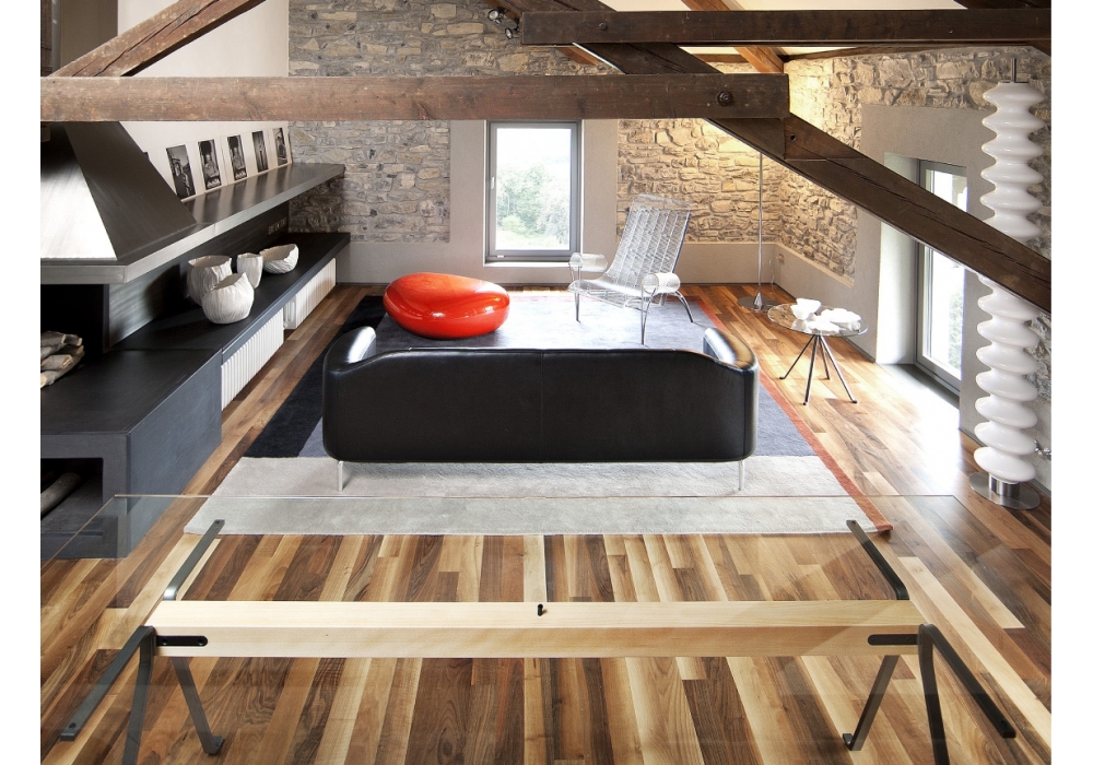 Frate, von Enzo Mari für Driade entworfen, ist ein Tisch mit Struktur aus anthrazitschwarz lackierten Stahlprofilen, die durch einen massiven Buchenbalken, Canaletto-Walnuss-Essenz, fossile Eichen-Essenz oder schwarz gebeizte Eichen-Essenz verbunden sind. Rechteckige Platte aus gehärtetem Glas th. 12mm. Erhältlich in verschiedenen Größen.