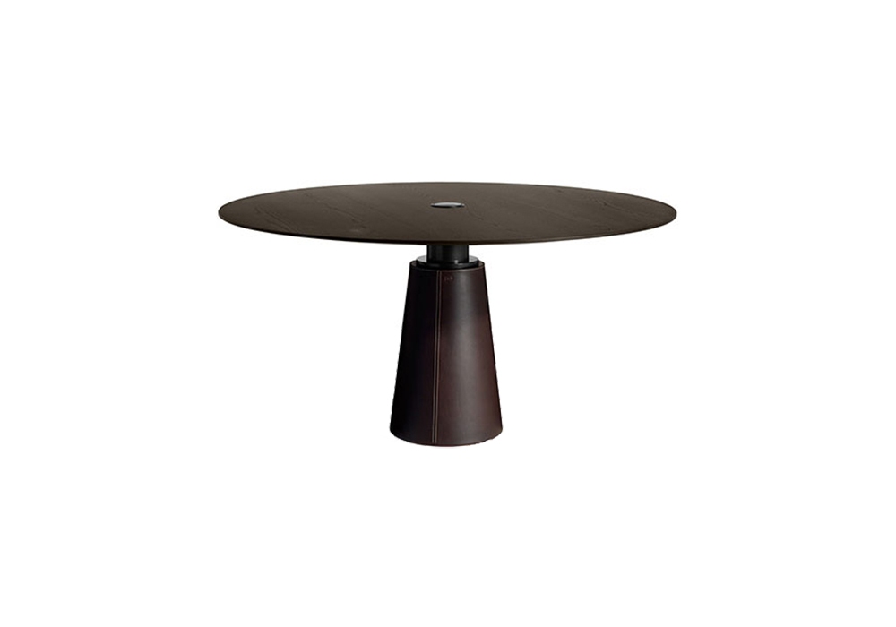 Mesa Due von Lella und Massimo Vignelli für Poltrona Frau entworfen, ist ein Tisch mit Sockel aus Serena-Stein oder Stahl, gepolstert mit Pelle Frau SC-Leder oder Sattel und Tischplatte aus gebeizter Esche oder gepolstert mit Pelle Frau SC-Leder. Es ist in verschiedenen Größen erhältlich.