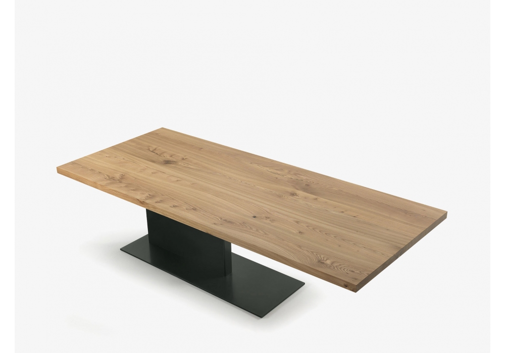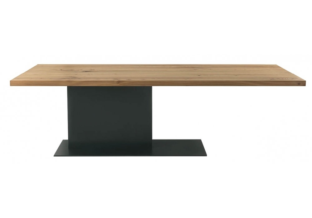 Liam Iron von C.R. & S. Riva 1920 entworfen, ist ein Tisch mit Platte aus Massivholz mit verleimten Brettern mit eckigen Seiten, kombiniert mit einer Eisenbasis, die aus einem asymmetrischen Bein, das seitlich positioniert ist, und einer Bodenplatte besteht.