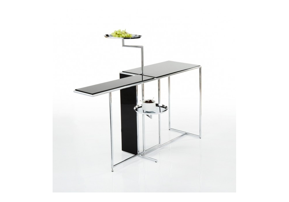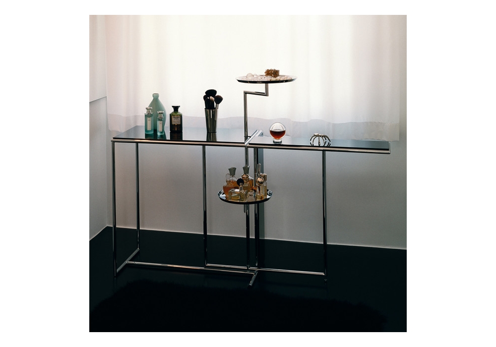 Rivoli von Eileen Gray für ClassiCon entworfen, ist ein Beistelltisch mit einer klappbaren Tischplatte und zwei drehbaren Tabletts. Gestell und Tabletts aus verchromtem Stahl. Tischplatten aus MDF hochglanzlackiert. In verschiedenen Ausführungen erhältlich.