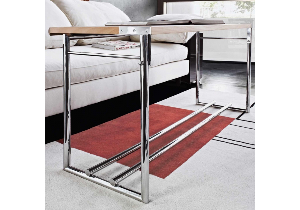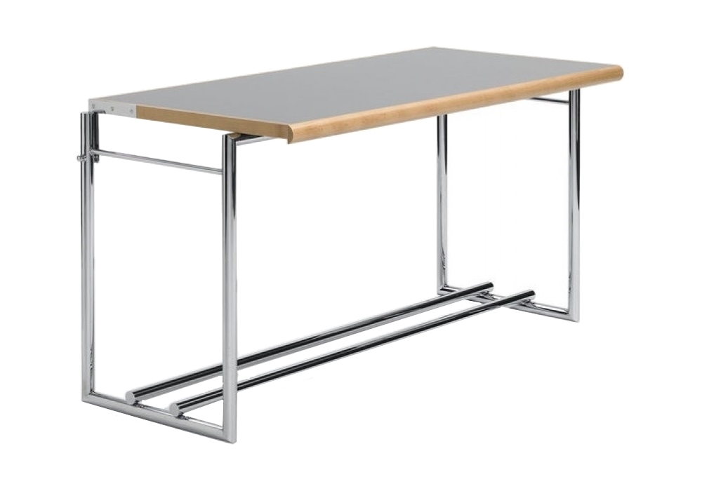 Menton von Eileen Gray für ClassiCon entworfen, ist ein schöner Tisch drehbar auf zwei Höhen. Gestell aus verchromtem Stahlrohr. Tischplatte: Oberfläche aus Linoleum, auf einer Seite schwarz, auf der anderen grau, mit massivem Umleimer aus Buche. Durch eine einfache Drehung der Platte erhält man je nach Wunsch einen niedrigen oder einen hohen Tisch.