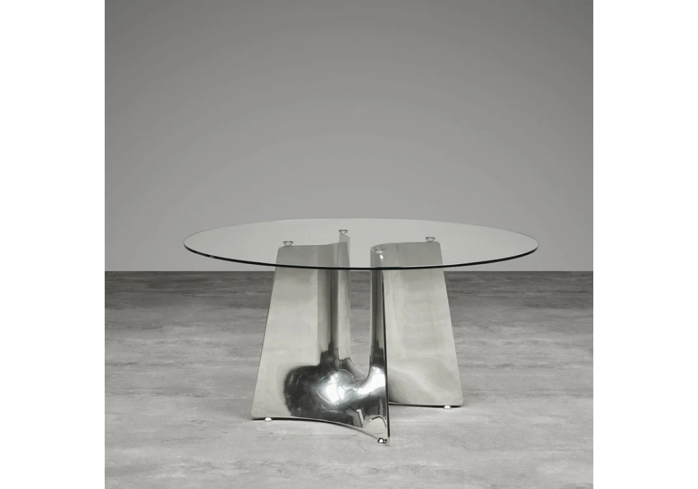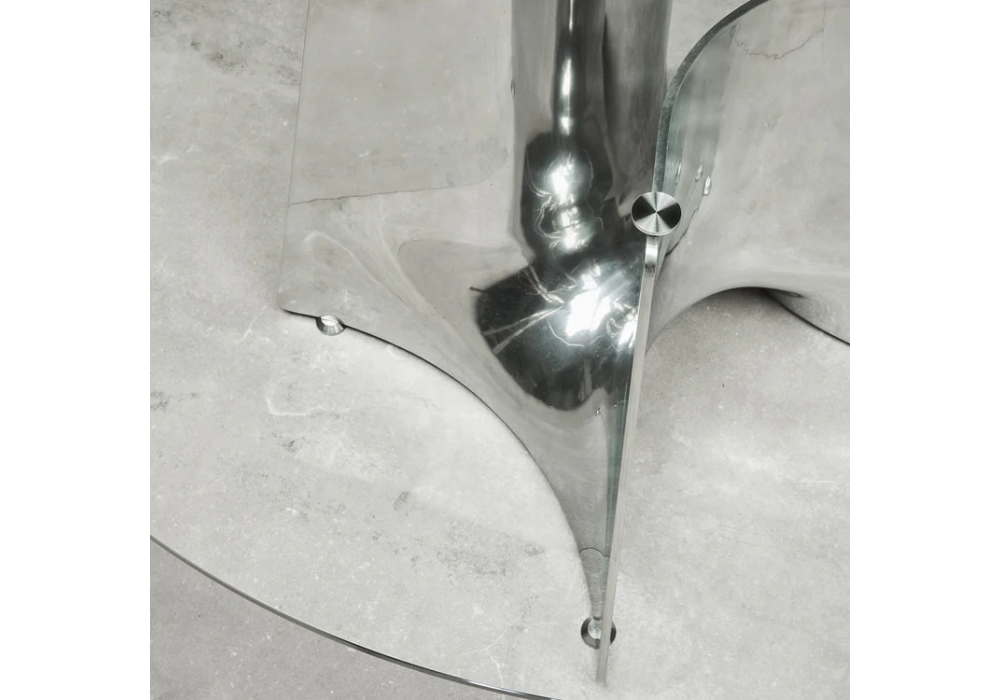 Bentz von Jeff Miller für Baleri Italia entworfen, ist ein schöner Tisch mit Gestell aus Aluminiumguss und 10 mm starken temperierten Kristallglasplatten, rund, quadratisch, rechteckig oder elliptisch, die durch einen innovativen Mechanismus am Gestell befestigt werden.