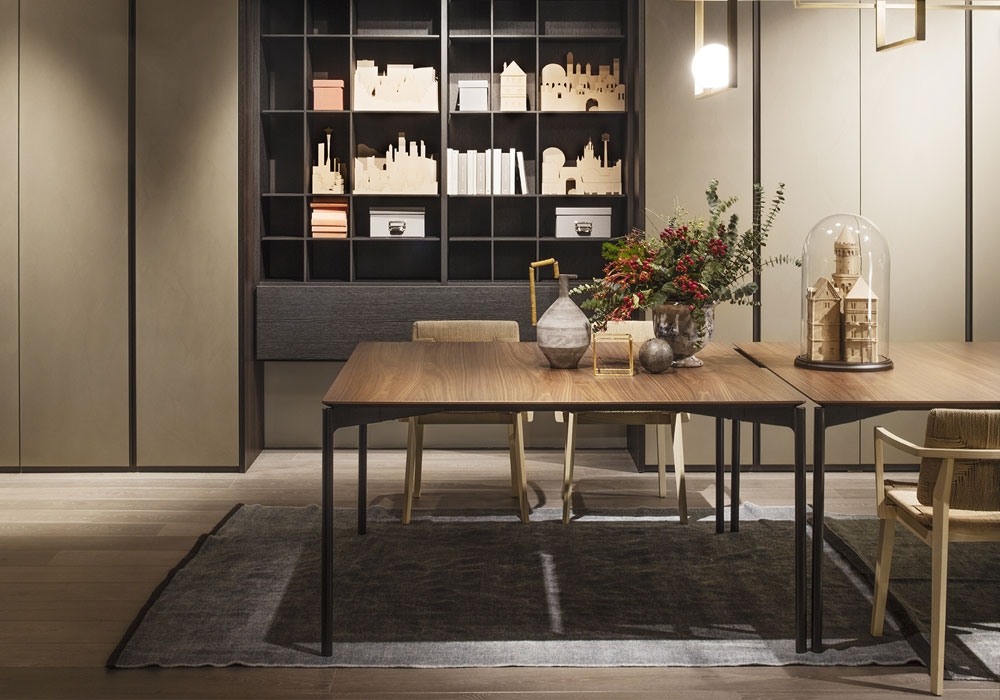 Luce von Piero Lissoni für Lema entworfen, ist ein Tisch mit Struktur aus brüniertem Metall und Oberteil aus wärmebehandelter Eiche.