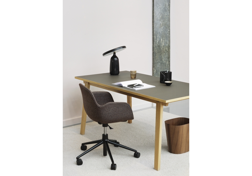 Slice, von Hans Hornemann für Normann Copenhagen entworfen, ist ein komplett aus Eiche gefertigter Tisch mit Linoleum furnierter Platte. Linoleum als Naturprodukt hat antibakterielle und selbstheilende Eigenschaften, mit samtiger Oberfläche, weicher und angenehmer Haptik und dank der Widerstandsfähigkeit der Materialien ist die Slice-Serie perfekt für den häufigen Gebrauch. Slice ist in verschiedenen Ausführungen und Größen erhältlich.