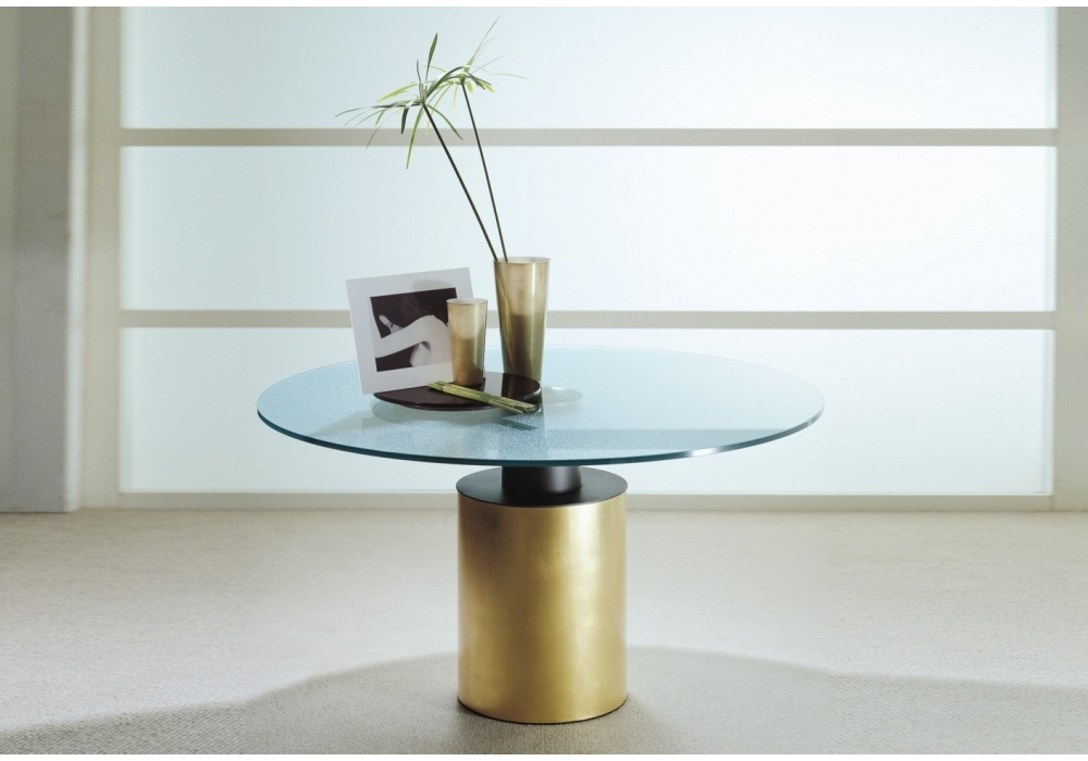 Creso von Lella & Massimo Vignelli für Acerbis entworfen, ist ein schöner Tisch mit dicke Säulenfuß aus Metal in unterschiedlichen Ausführungen. Metallkapitel in der Farbe Glimmergrau. Die Platte ist durch Edelstahlscheibe auf das Gestell eingeschraubt, sie ist sichtbar bei der Kristallplatte.