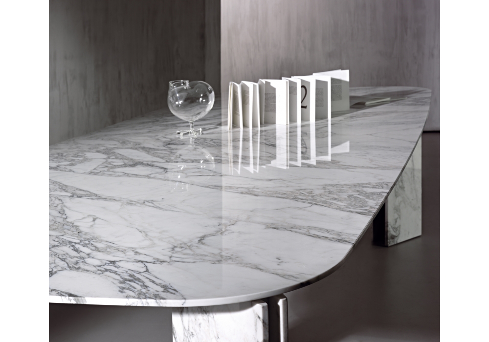 Maxwell von Massimo Castagna für Acerbis entworfen, ist ein Tisch aus Stein und Metall. Die essentielle Form unterstreicht die außergewöhnliche Persönlichkeit der gewählten Steinart, die ihre Lebendigkeit den Maserungen und Abstufungen verdankt, den intensiven Schattierungen, der Leuchtkraft, dem Mosaik aus Mineralien, die sich während eines Jahrtausende lang dauernden metamorphen Prozesses entwickelt haben und meisterhaft in ihrer ganzen Schönheit ans Licht gebracht wurden. Die scheinbare Leichtigkeit der Tischplatte mit abgeschrägter Kante steht im Kontrast zur imposanten Erscheinung der Tischbeine mit ihrer besonderen “V”-Form und ihrer Realisierung mit materiellen Gegensätzen, in Form einer innovativen Verbindung von Stein mit einer Struktur aus Metall. Verfügbar in mehreren Ausführung und Größen.