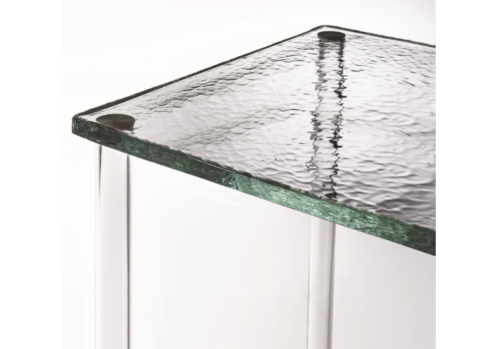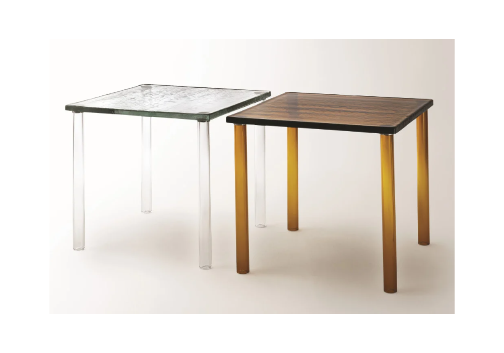 Nesting von Ronan & Erwan Bouroullec für Glas Italia ist ein Tisch, der vollständig aus Muranoglas besteht. Die zylindrischen Beine bestehen aus geblasenem Glas und sind mittels verschraubter Edelstahlplatten an der Tischplatte befestigt.