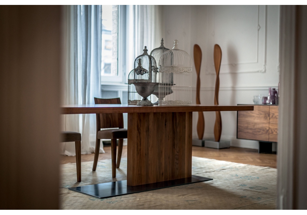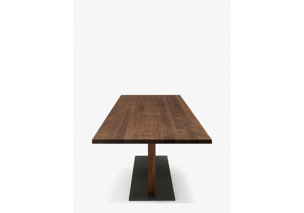 Liam Wood entworfen von C.R. & S. Riva 1920, ist ein komplett aus Massivholz gefertigter Tisch mit verleimten Brettern und eckigen Seiten, kombiniert mit einem asymmetrischen Holzbein, das seitlich positioniert ist, und einer eisernen Bodenplatte.