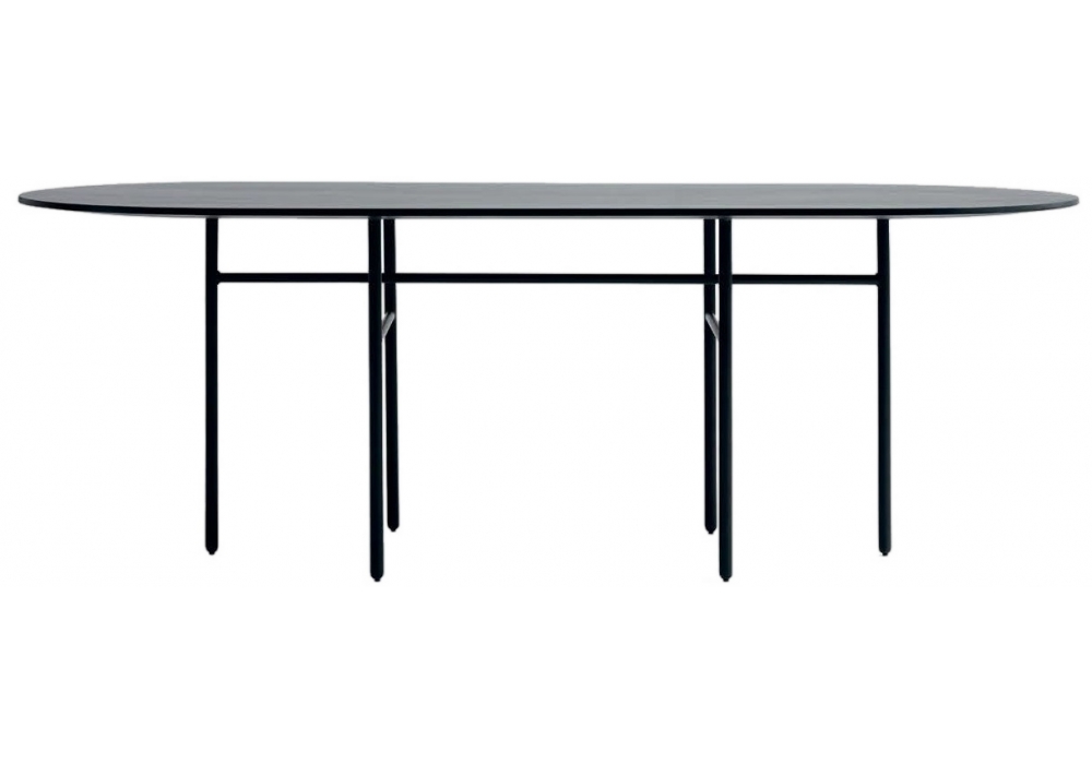Snaregade Oval von Norm Architects für Audo Copenhagen entworfen, ist ein ovaler Tisch mit Eichenholzplatte, erhältlich in verschiedenen Ausführungen, auf einem schwarz pulverbeschichteten Stahlgestell.
