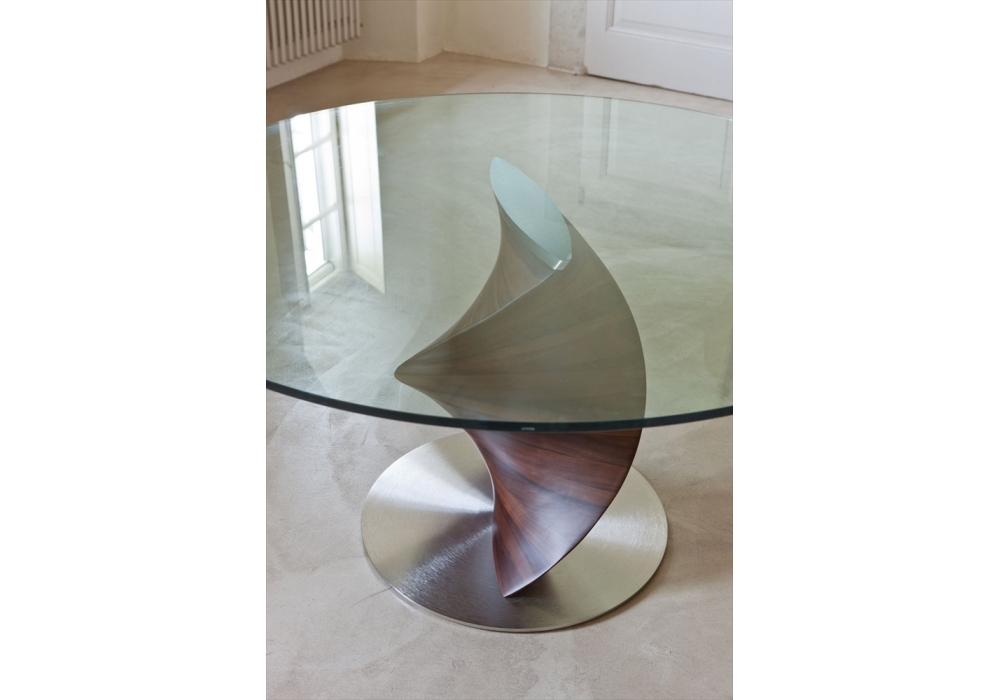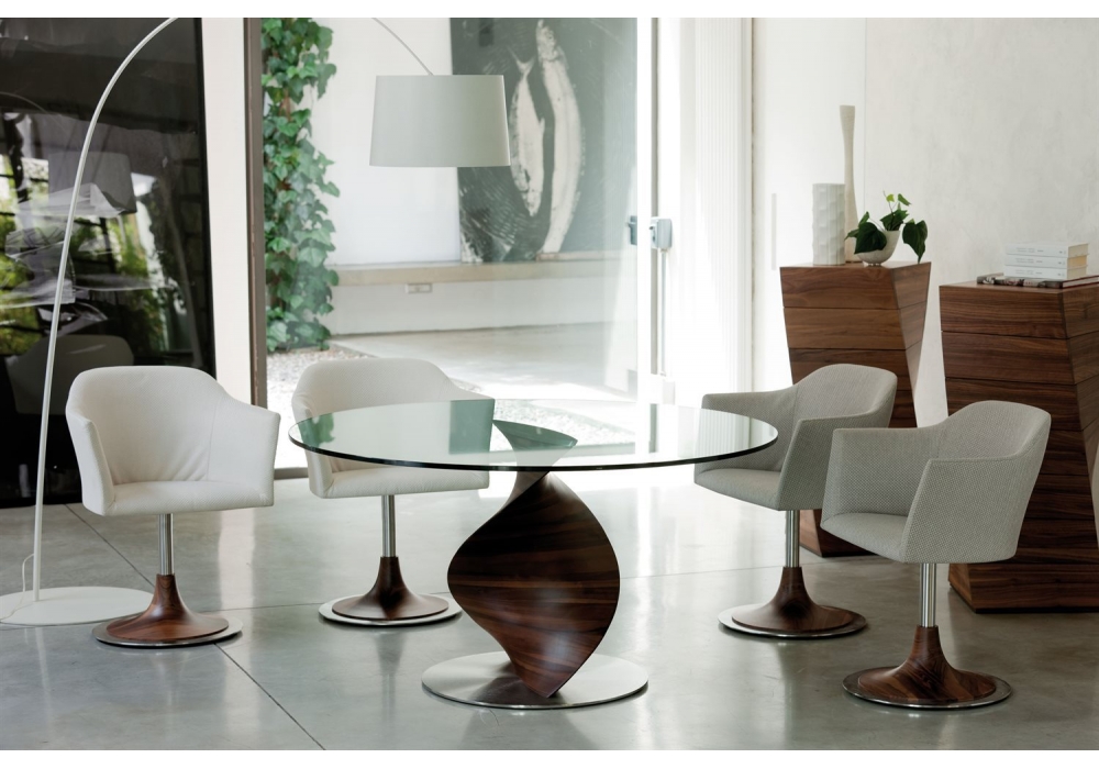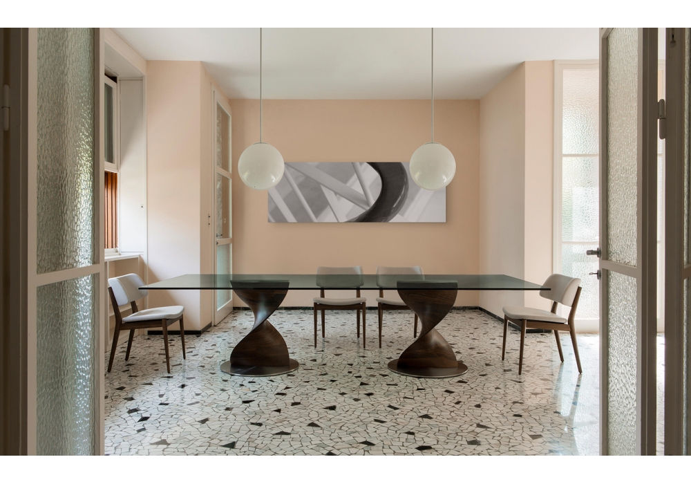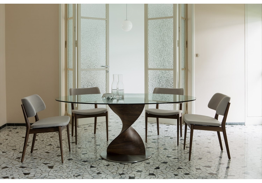 Elika, von Gino Carollo für Porada entworfen, ist einer Esstisch mit Gestell aus massivem Nussbaum Canaletta oder Esche auf eine Metallplatte und ESGGlasplatte (Stärke mm. 12). Verfügbar in verschiedenen Abmessungen.