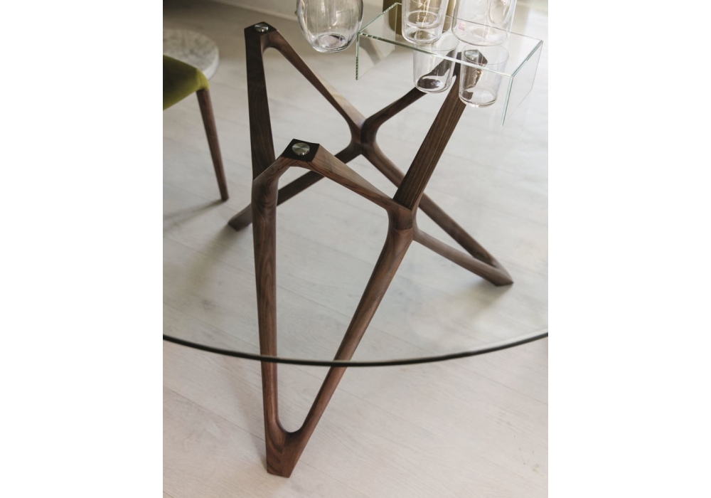 Circe C, von D. Dolcini für Porada entworfen, ist einer Esstisch mit Gestell aus massivem Nussbaum Canaletta. Tischplatte aus transparentem oder geräuchertem Glas (Stärke mm. 12). Verfügbar in verschiedenen Abmessungen.