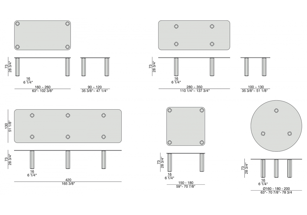 | Abmessungen | L 160 x W 90 x H 73 cm; L 260 x W 120 x H 73 cm; L 280 x W 100 x H 73 cm; L 350 x W 130 x H 73 cm; L 420 x W 130 x H 73 cm; L 150 x W 150 x H 73 cm; L 180 x W 180 x H 73 cm; Ø 160 x H 73 cm; Ø 180 x H 73 cm; Ø 200 x H 73 cm |