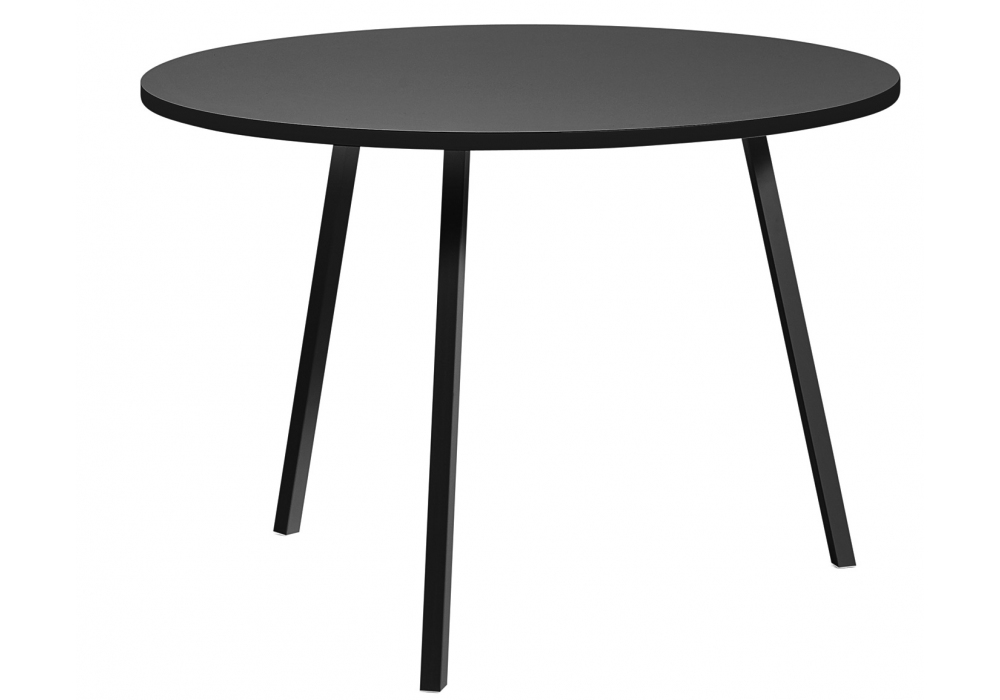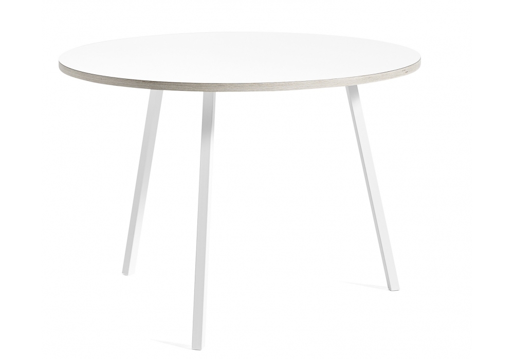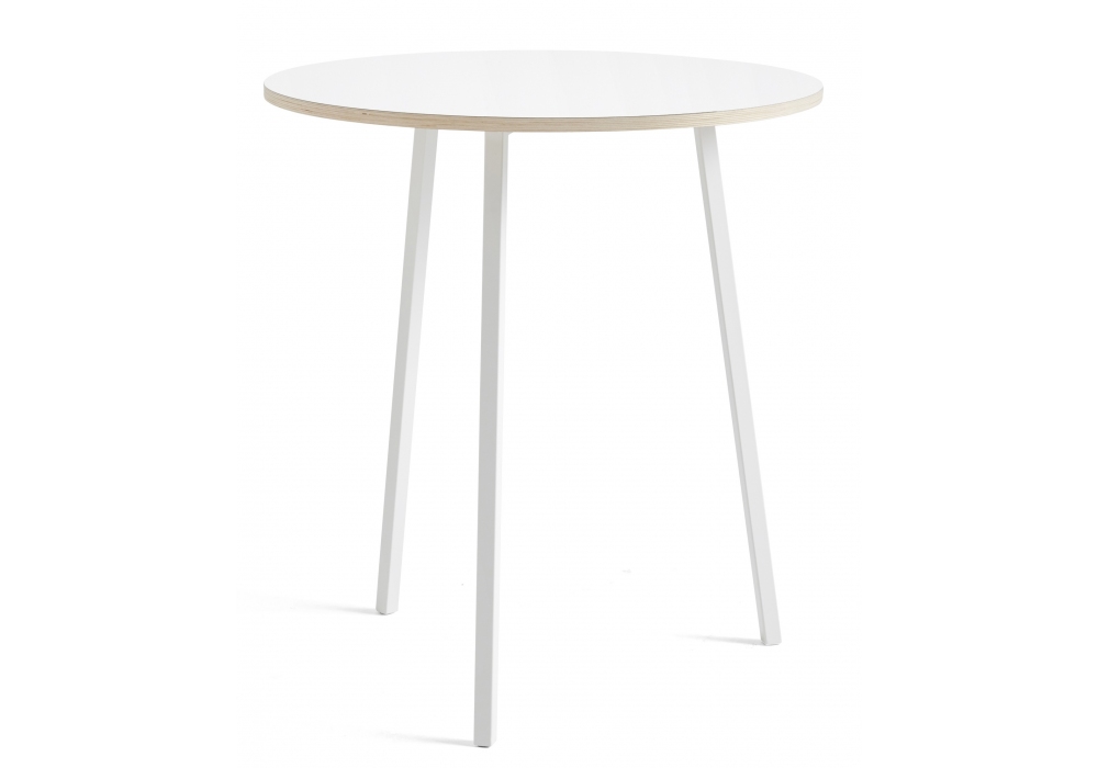 Loop Stand Round, von Leif Jørgensen für Hay entworfen, ist ein Tisch mit Platte aus weißem Laminat oder schwarzem Linoleum und passenden Beinen aus pulverbeschichtetem Aluminium. Verfügbar in verschiedenen Abmessungen und Ausführungen