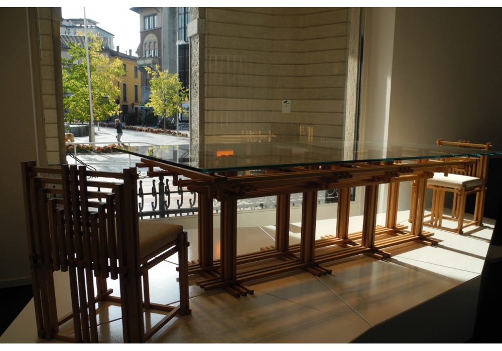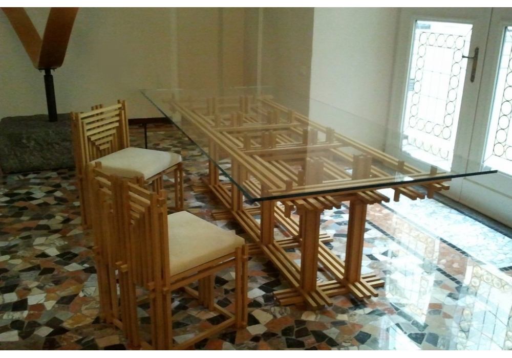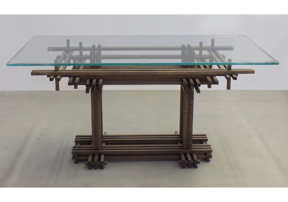 Yagura von Garde-Italy für Emmemobili entworfen, ist ein Tisch mit Untergestell mit Streifen aus Eiche Kernholz, verfügbar in verschiedenen Ausführungen. Oberseite aus extra-klarem Glas mm.15. Auch verfügbar in 4 Abmessungen.