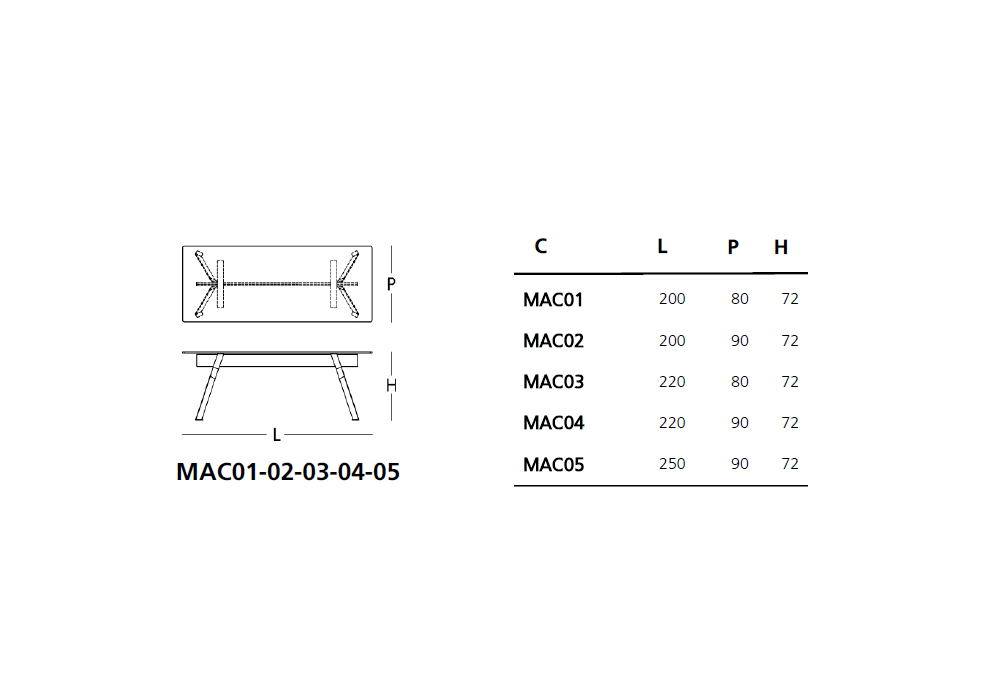 | Abmessungen | 200 x 80 x H 72 cm (MAC01L); 200 x 90 x H 72 cm (MAC02L); 220 x 80 x H 72 cm (MAC03L); 220 x 90 x H 72 cm (MAC04L); 250 x 90 x H 72 cm (MAC05L); |