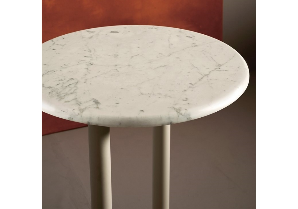 Strong von Eugeni Quitllet für Desalto entworfen, ist ein Bistrotisch mit Stahlrohrgestell, verfügbar in verschiedenen Ausführungen. Platte aus Marmor (Ø 60 cm) oder Eichenholz (Ø 70 cm). Auch verfügbar in 3 Abmessungen.
