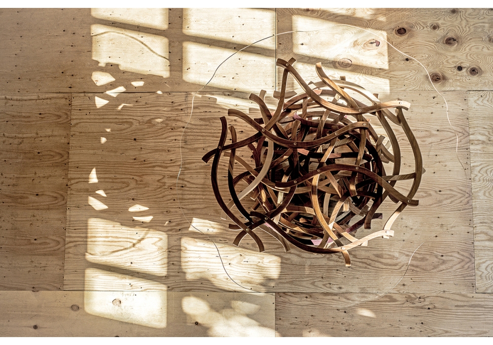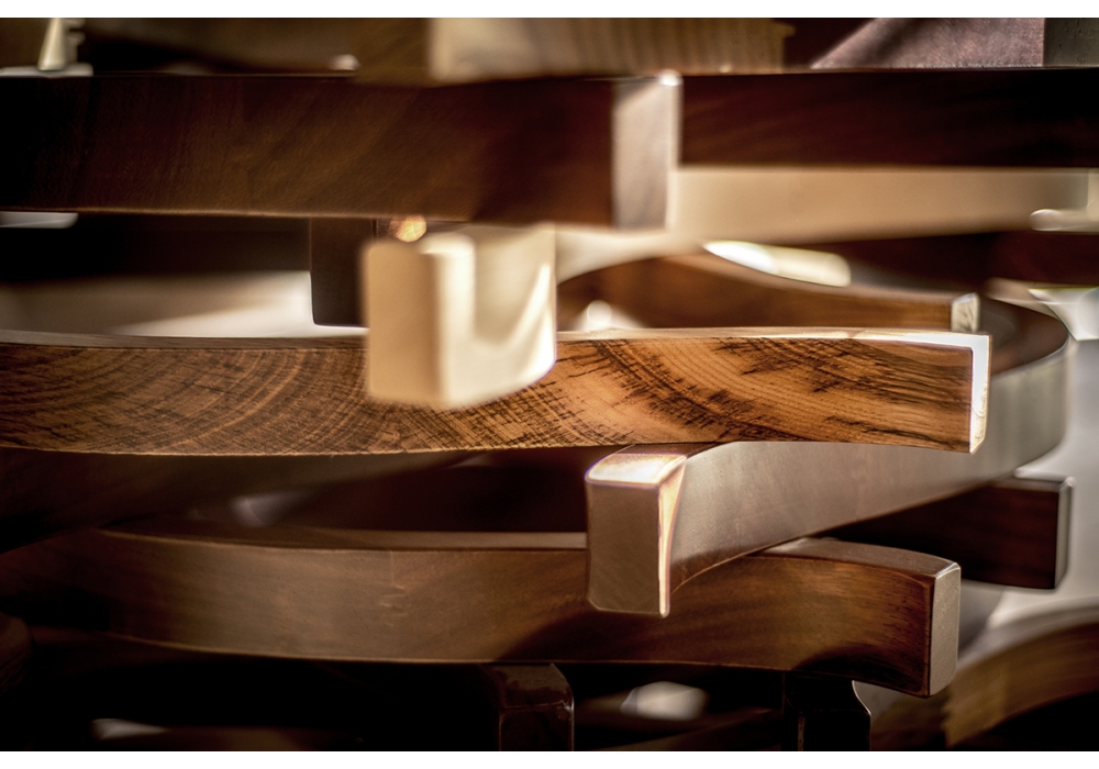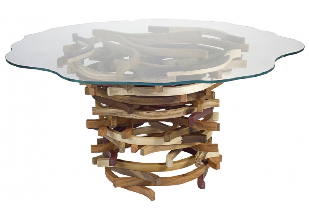 Forma Zero von Salvatore Longo für Ornythos entworfen, ist ein Esstisch mit einem zentralen Holzsockel, der eine Platte aus gehärtetem Glas trägt. Die Basis besteht aus verschiedenen Holzarten: Ätna-Kastanie, Iroko, Mahagoni, Ahorn, Lila, Ulme, Amazonas.