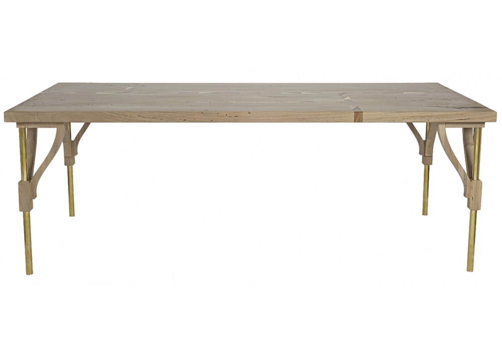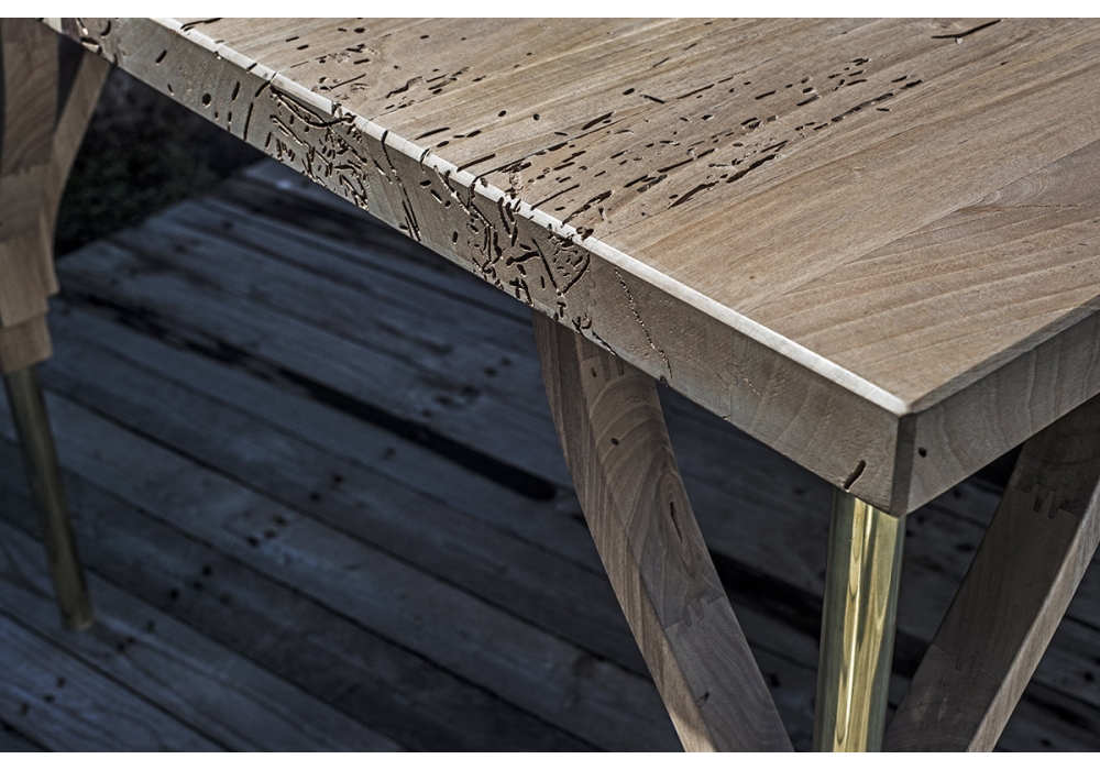Forma Quindici von Salvatore Longo für Ornythos entworfen, ist ein Esstisch aus Holz mit Messing- und Holzgestell, während die Platte aus Nussbaum mit Einlagen aus Kastanienholz, Wenge, Ahorn, Doussie, Lila, Ulme, Iroko und Amazonas besteht.