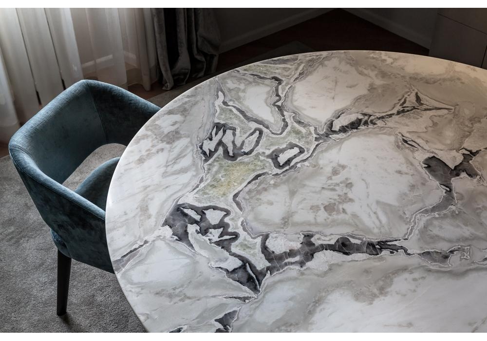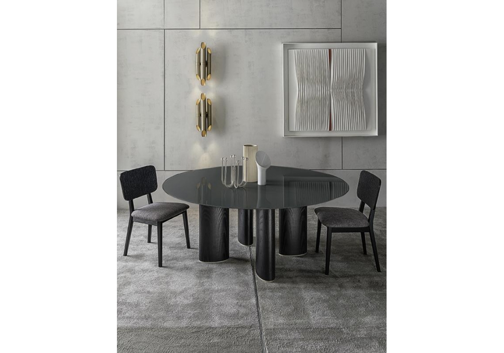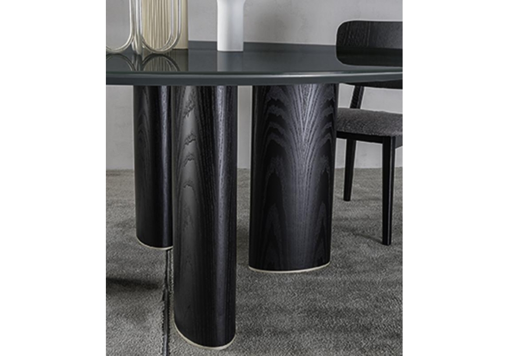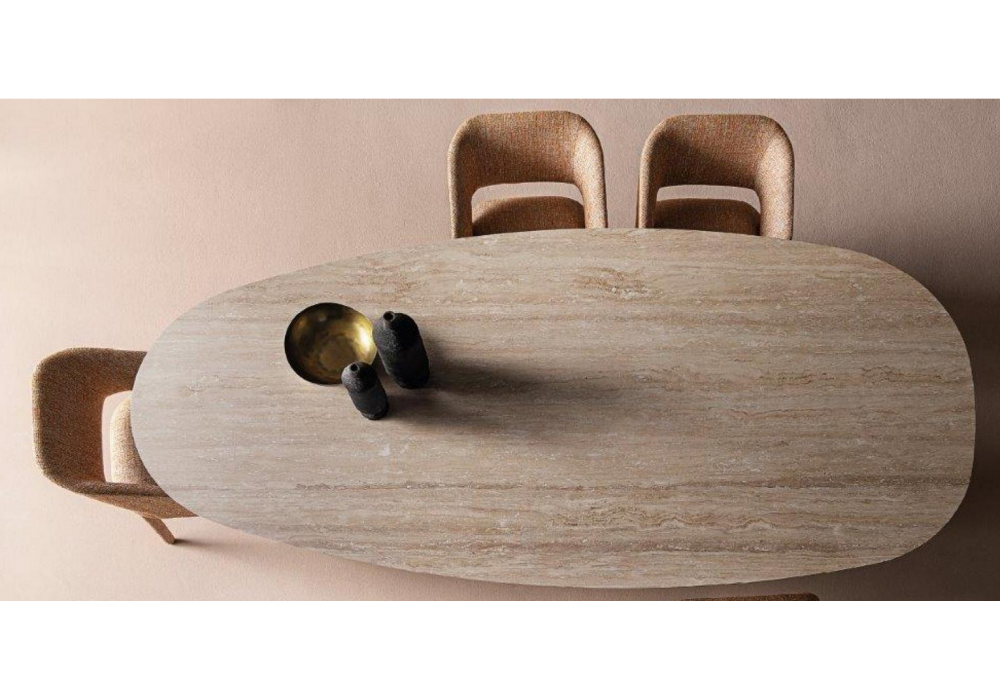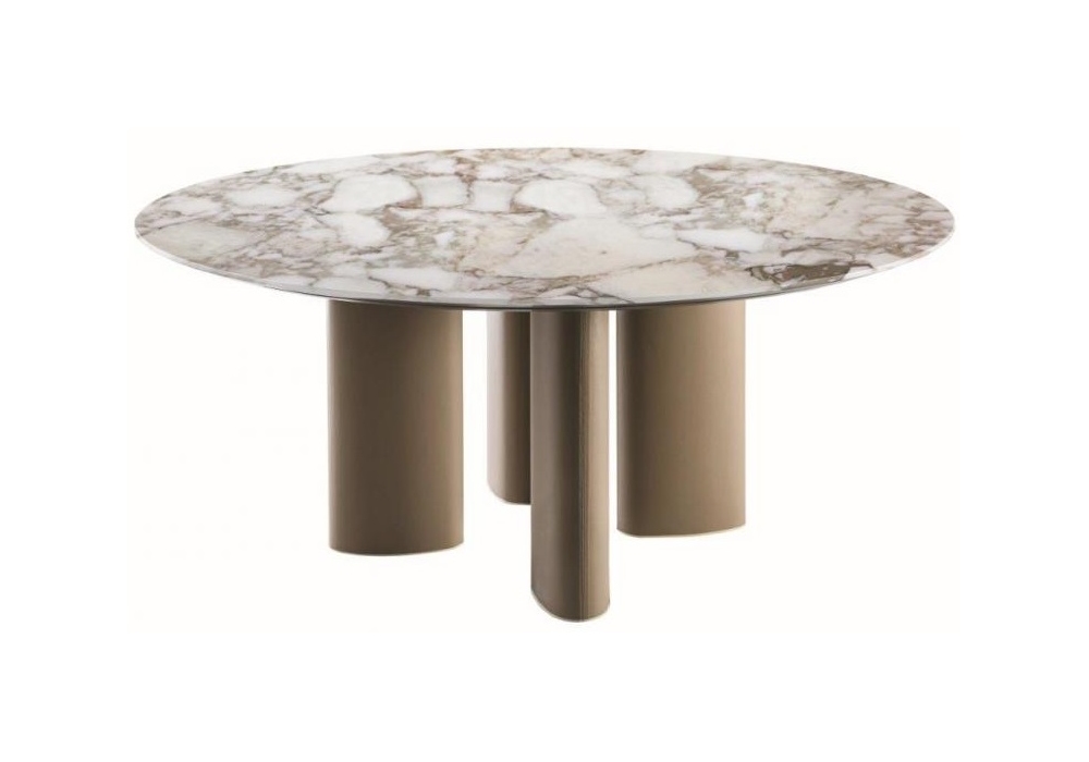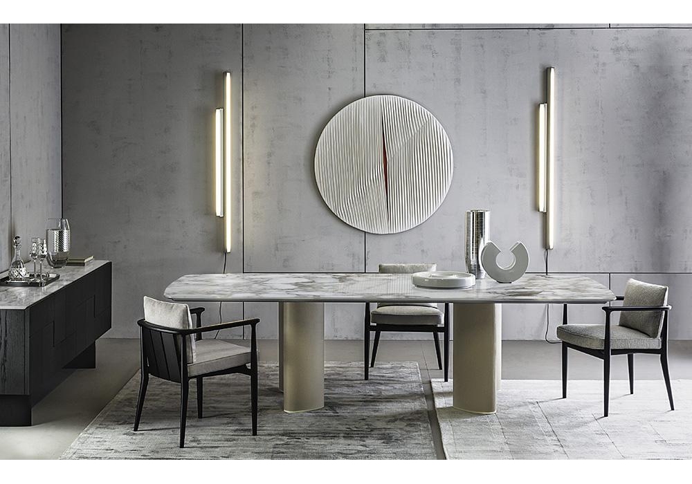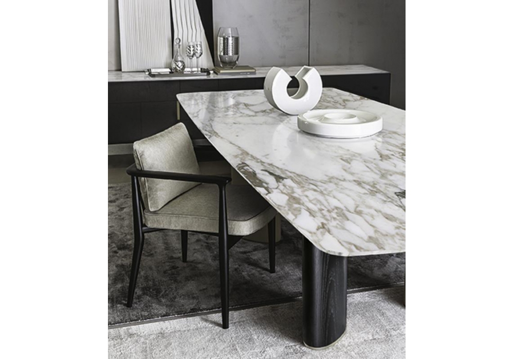 Arne, von Roberto Lazzeroni für Casamilano entworfen, ist ein Tisch mit einer Platte aus Marmor und einer Unterplatte aus lackiertem MDF. Die ovalen Beine sind mit Leder bezogen, lackiert oder mit geflammter Esche.