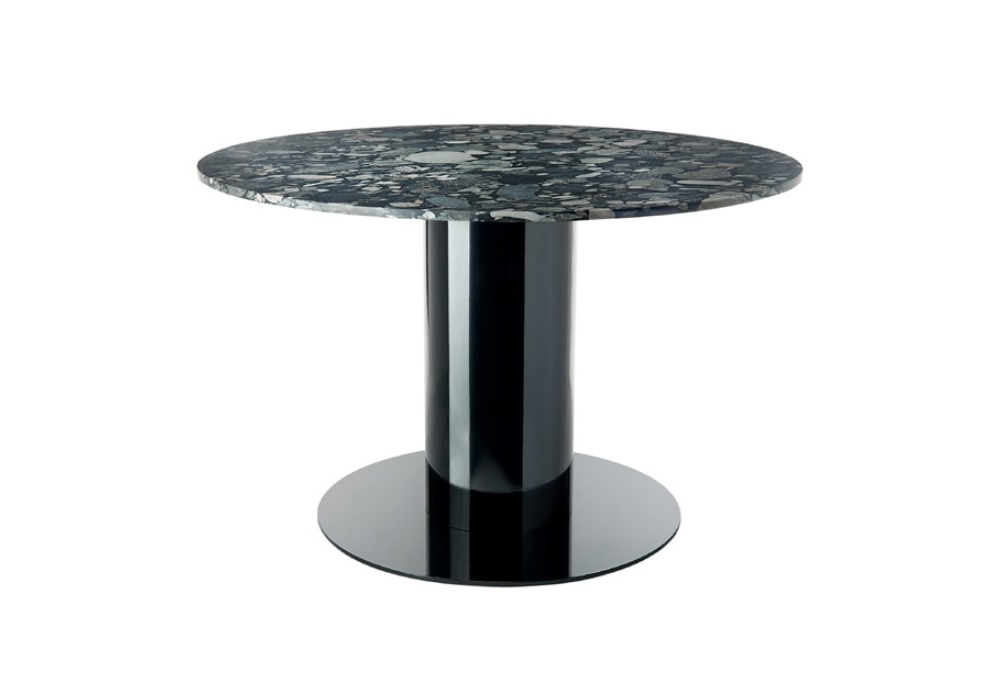 Tube Wide von Tom Dixon entworfen, ist ein Tisch mit runder Marmorplatte, verfügbar in verschiedenen Ausführungen. Bein und Sockel aus Metall in glänzendem Schwarz.