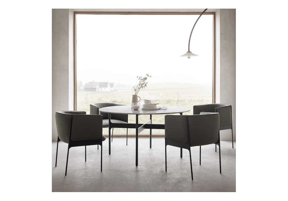 Floema. von Luca Nichetto für Wendelbo entworfen, ist ein Tisch mit schwarz pulverbeschichtetem Stahlgestell und Platte aus Marmor.