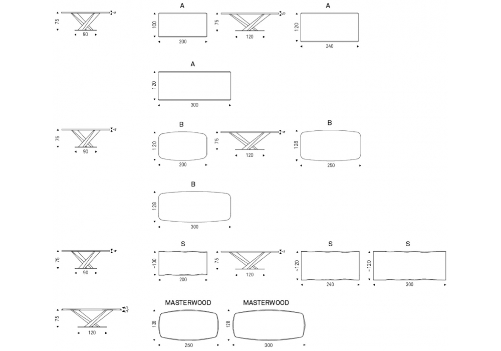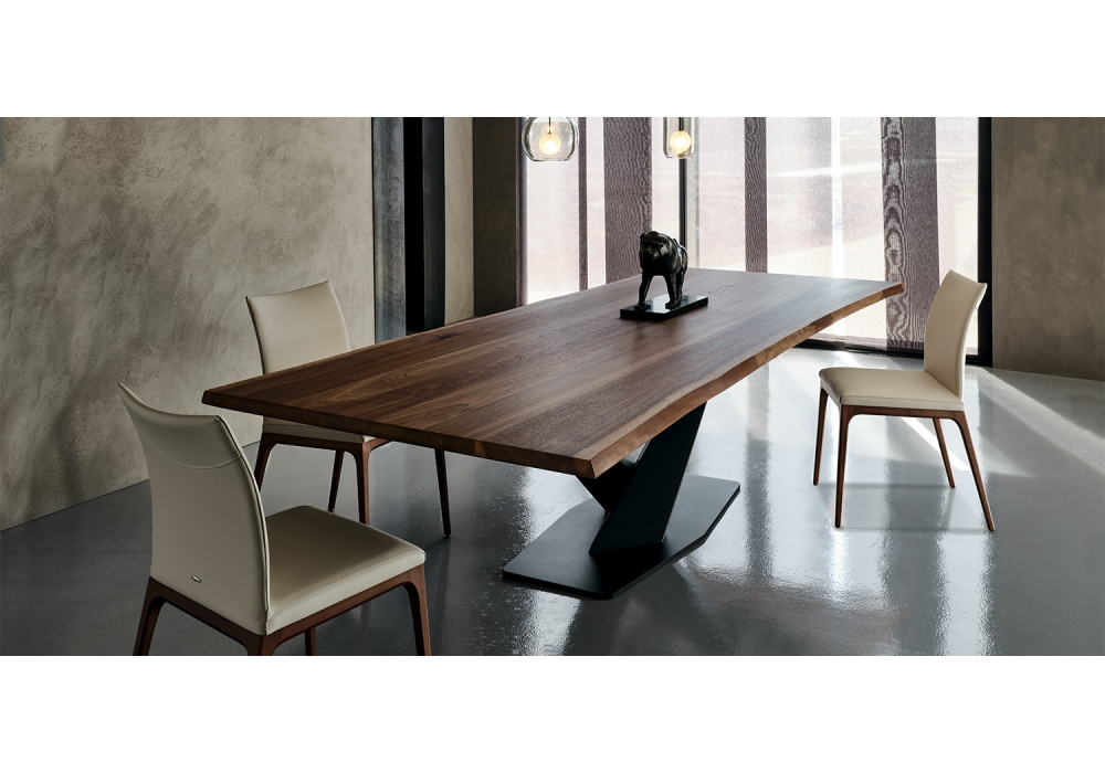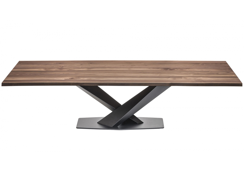 Stratos Wood von Studio Kronos für Cattelan Italia entworfen, ist ein Tisch mit Basis aus Stahl lackiert gaufriert. Version "S" mit unregelmäßigen Kanten aus Massivholz. Dicke der Platten 4 cm. Version "A": Platte mit schrägen Kanten. Die Platte 200x100 hat 4 cm Dicke, die Platten in 240x120 und 300x120 haben 5 cm Dicke. Version "B": Platte mit schrägen Kanten. Version “Masterwood”: bootsförmige Platte hergestellt aus verschiedenen, diagonal eingeordneten Leisten. Schräge und abgerundete Kanten.