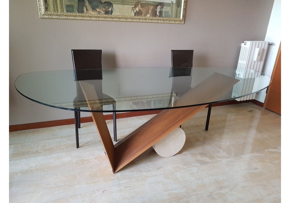 Valentino, von Emanuele Zenere für Cattelan Italia entworfen, ist ein Tisch mit basis aus Canaletto Nussbaum oder gebrannter Eiche, Zylinder aus Travertin oder Marmor und Tisch platte aus transparentem Kristall. Vefügbar in verschiedenen Ausführungen und Modellen.