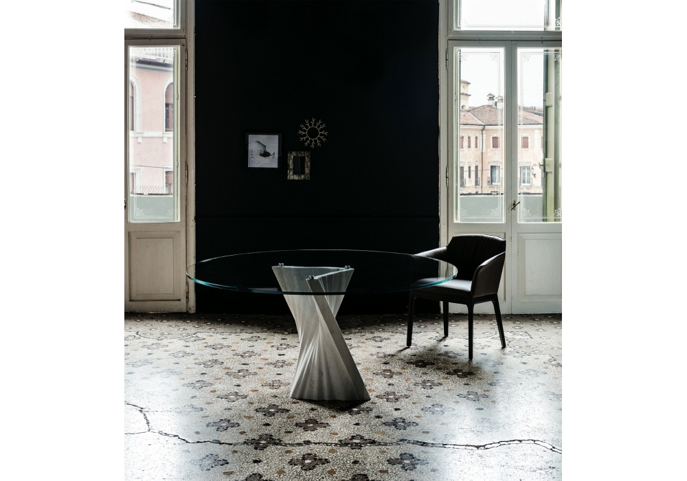 Plisset, von Raffaello Galiotto für Cattelan Italia entworfene, ist ein Tisch mit Marmorsockel und Platte aus 15 mm dickem transparentem Glas. Verfügbar in verschiedenen Modellen. Platte 182 x 90 und 200 x 106 sind 12 mm dick.